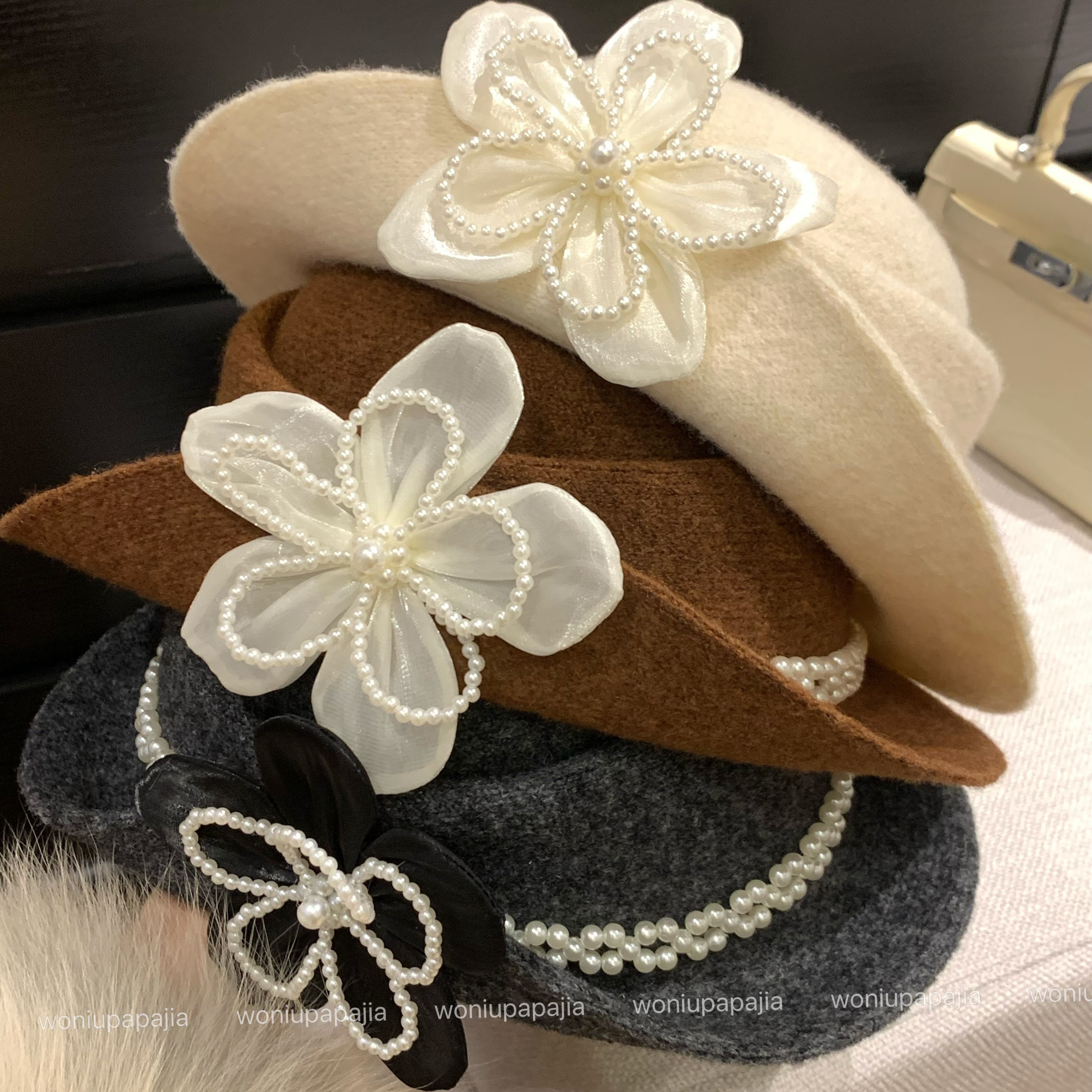 高端羊毛仿珍珠卷边玫瑰花礼帽女