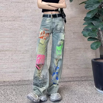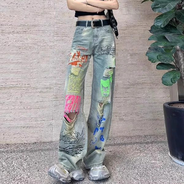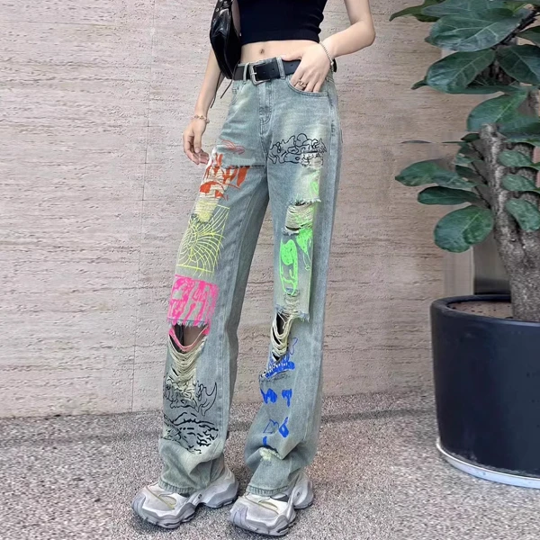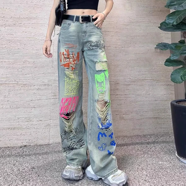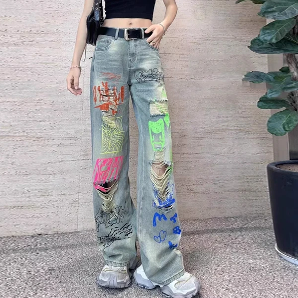 2025夏季新款个性涂鸦印花破洞牛仔裤女设计感复古宽松直筒阔腿裤