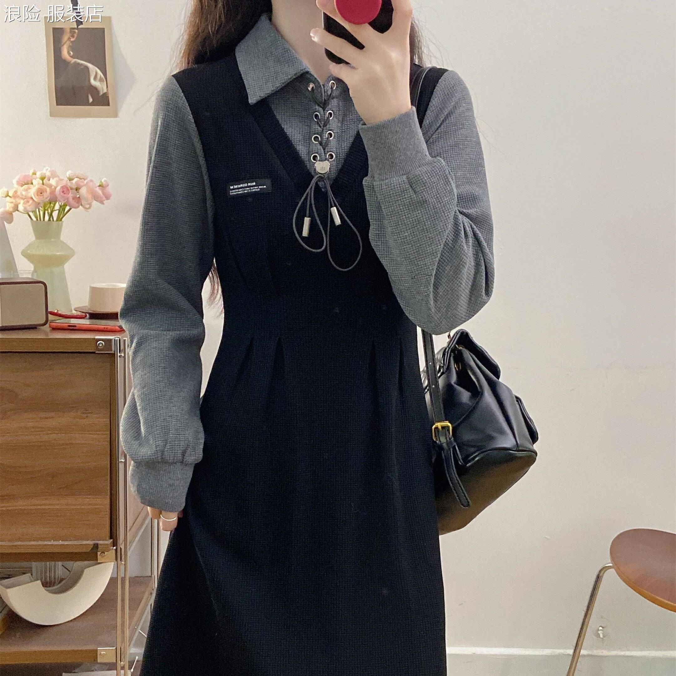 浪险大码秋冬季黑色加厚针织连衣裙女胖mm假两件韩系搭配一整套装