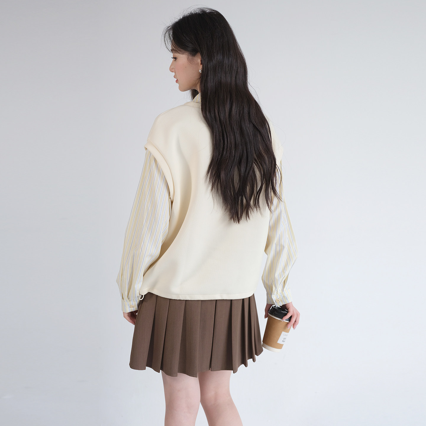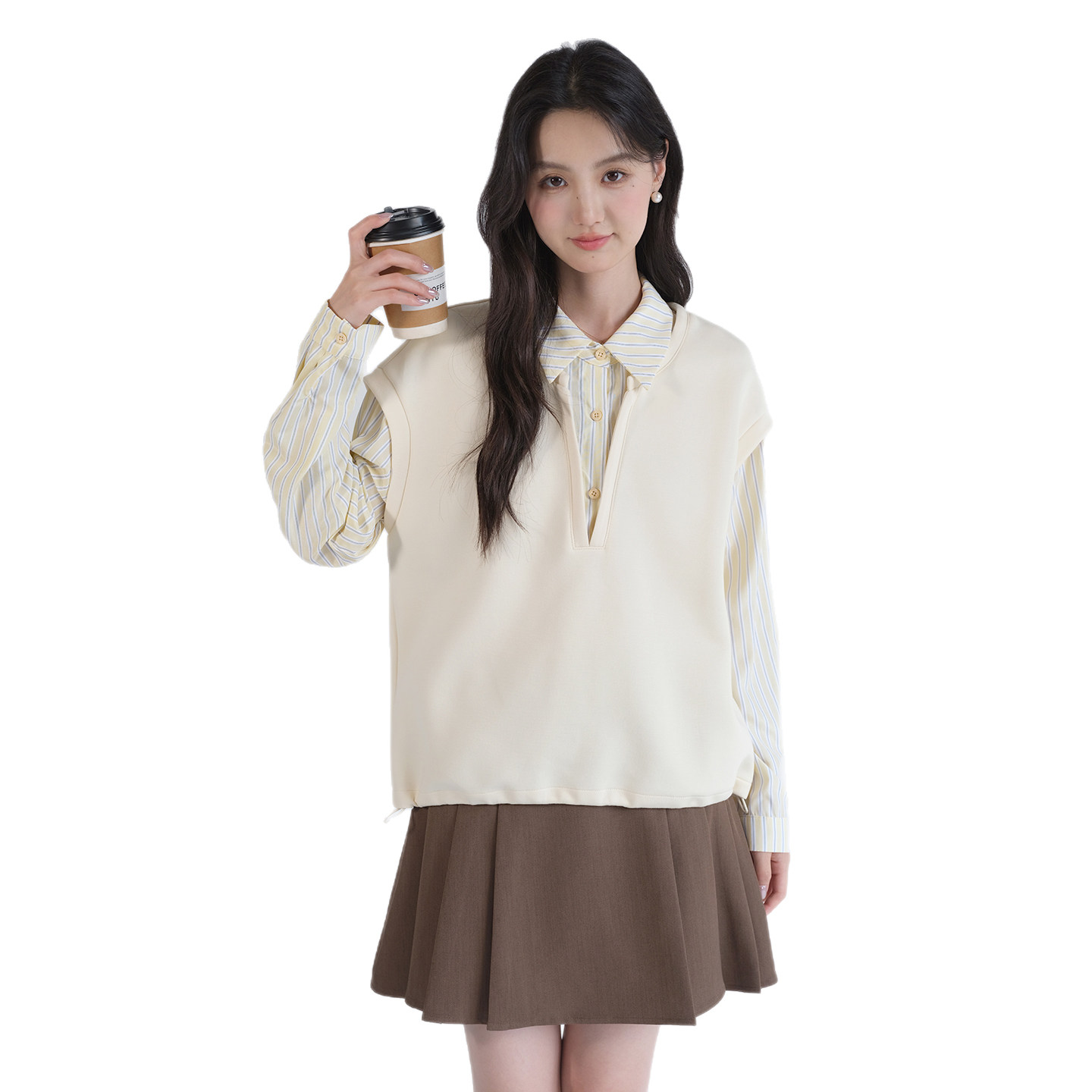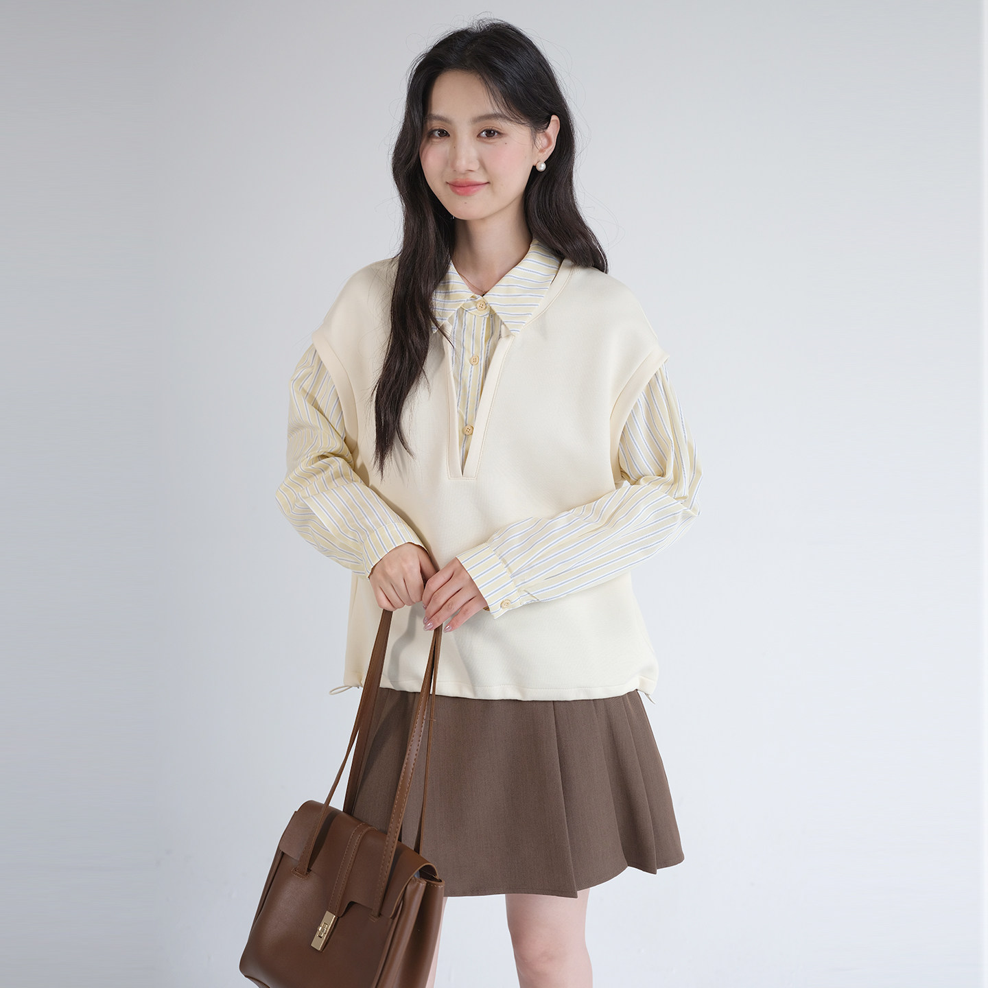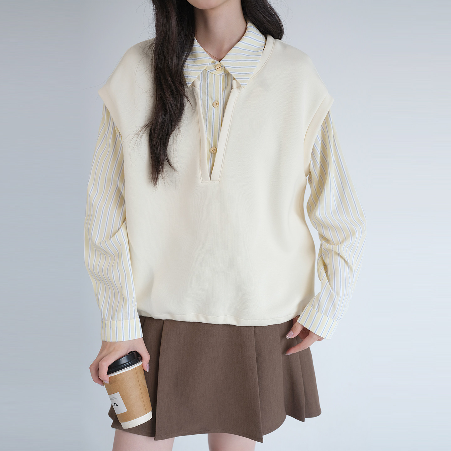 蓝若水大码女装2026春装新款假两件拼接条纹衬衫胖mm韩系翻领上衣