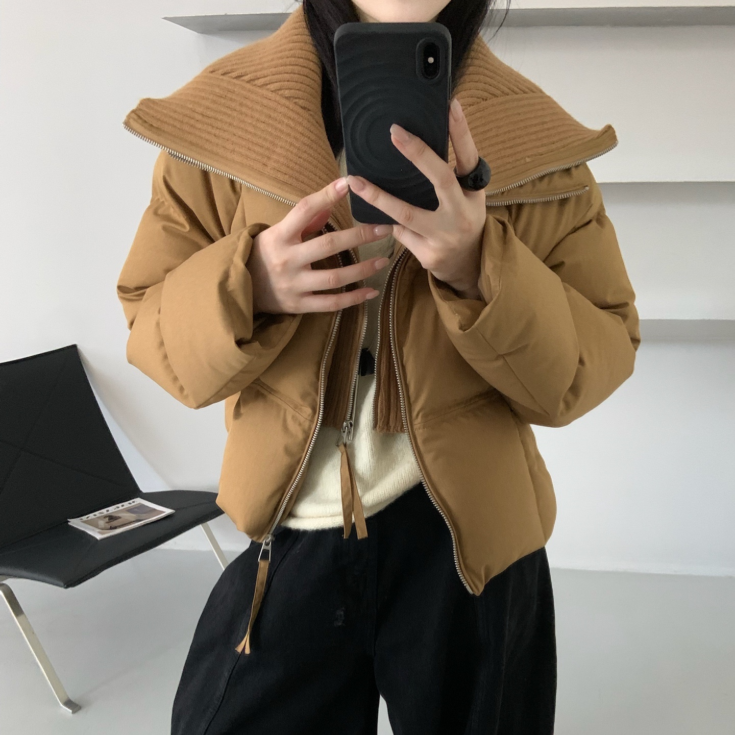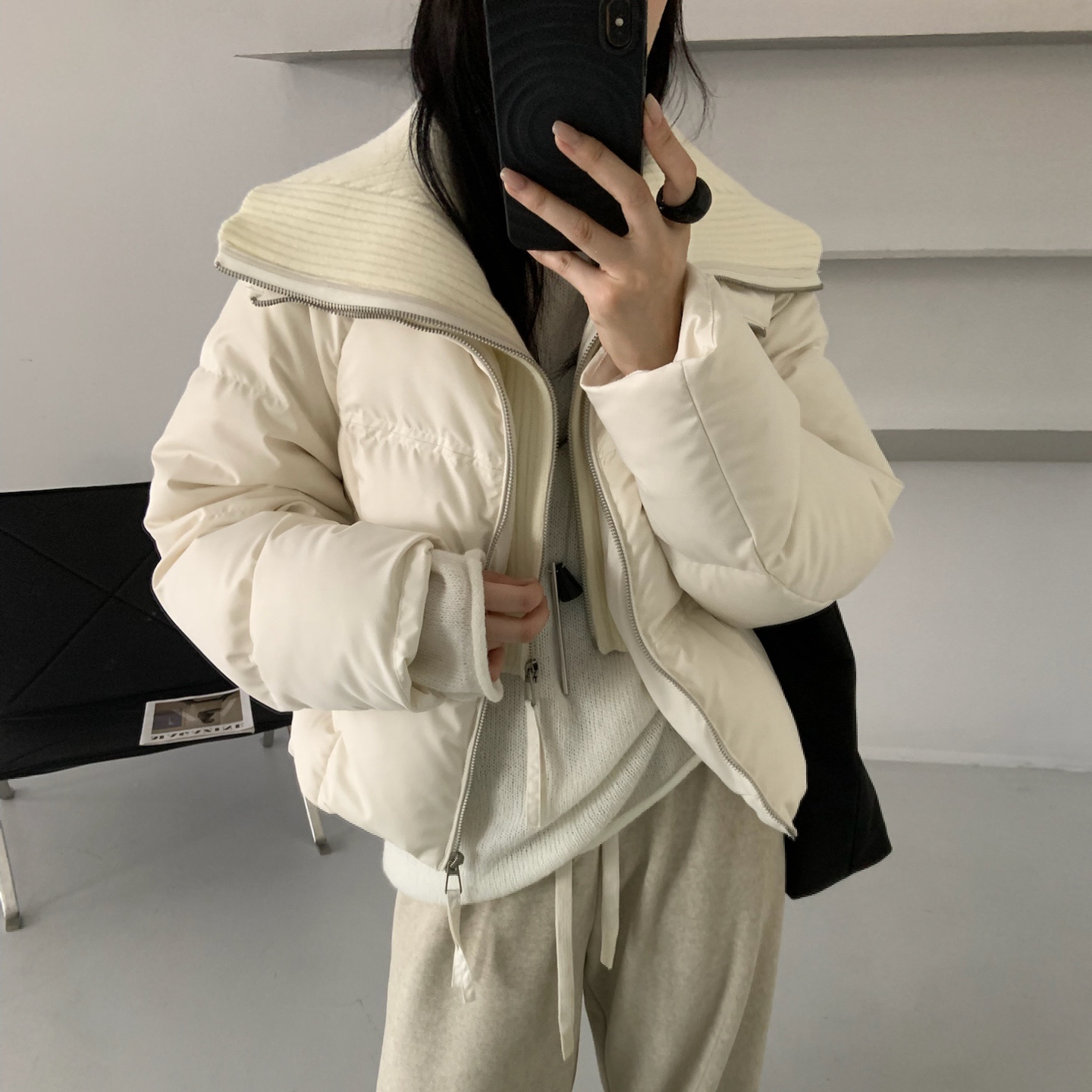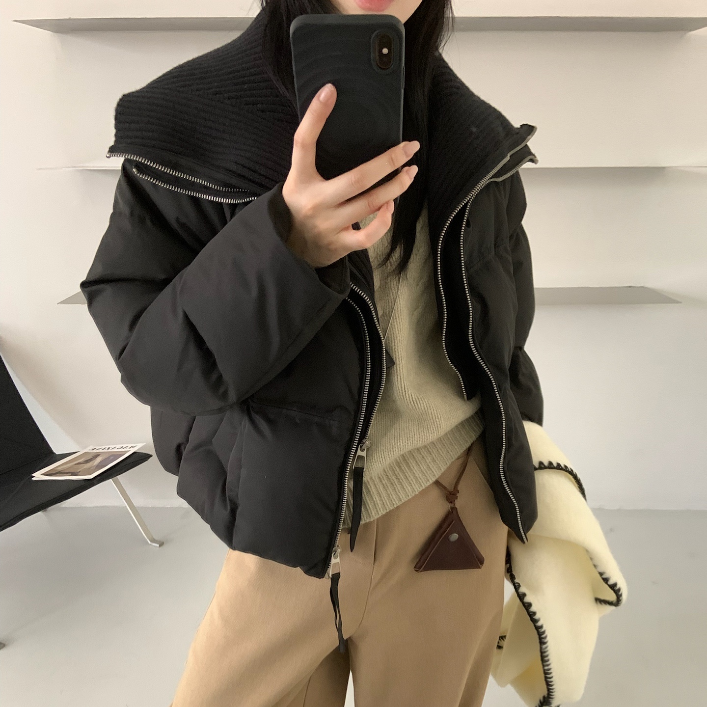 2025冬季韩系针织拼接翻领羽绒服女短款小个子90白鸭绒面包服外套