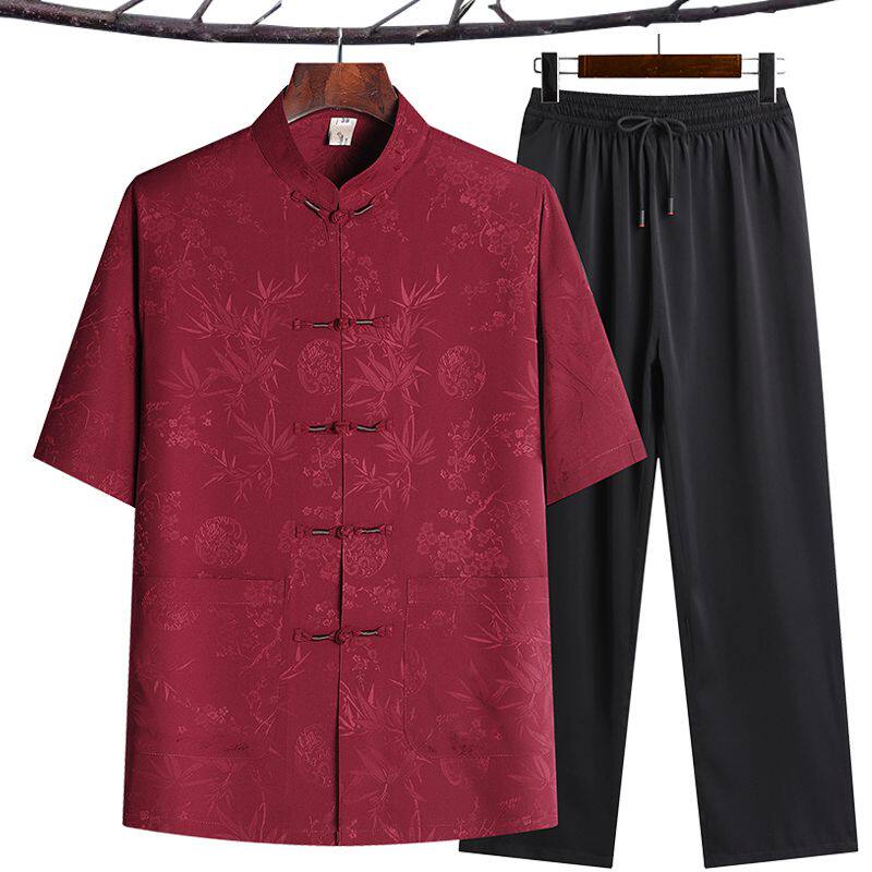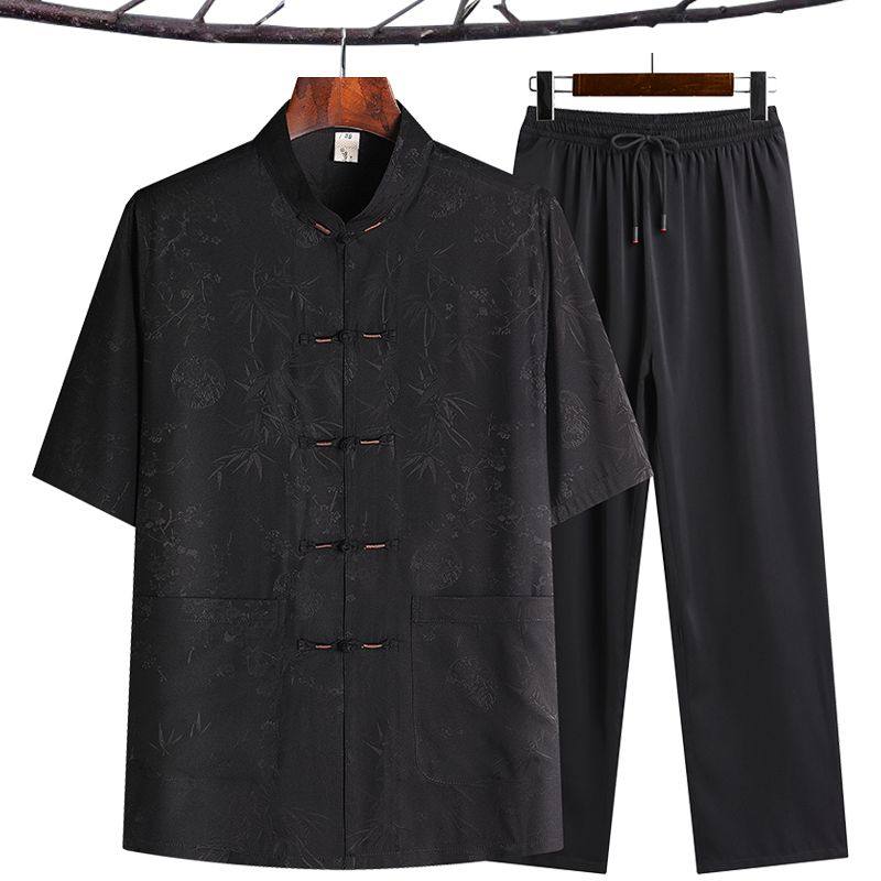 中国风唐装汉服男冰丝短袖爸爸夏装两件套装中老年人爷爷复古衣服