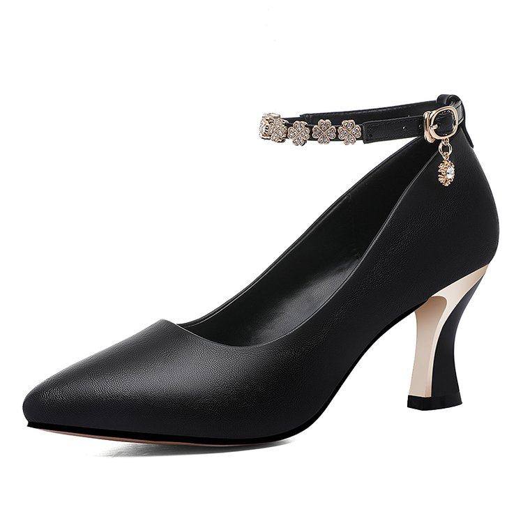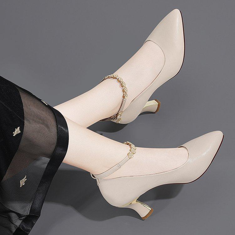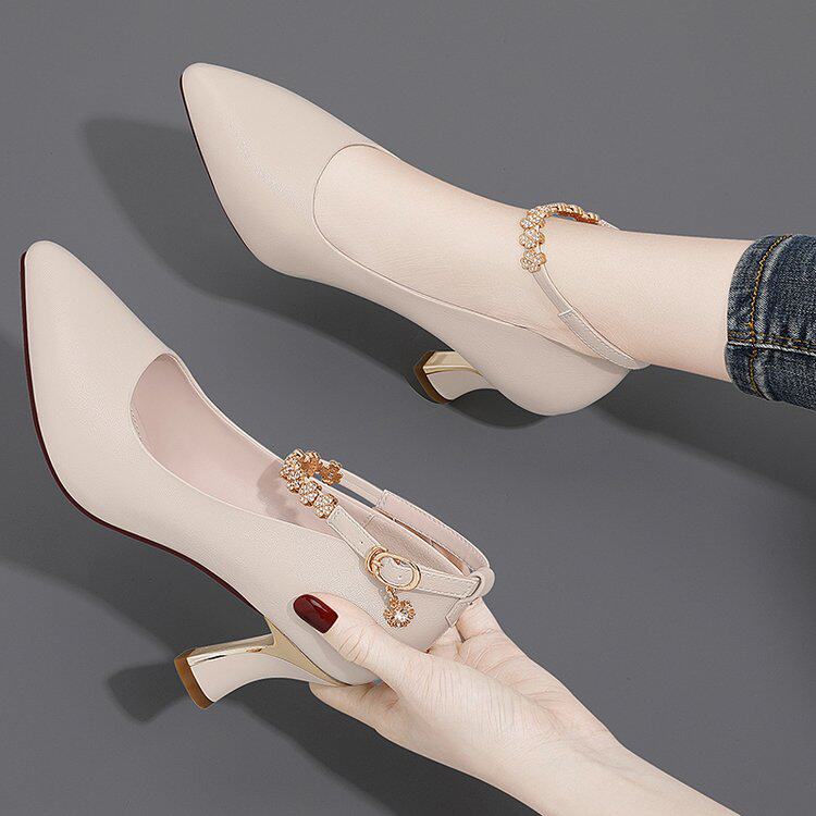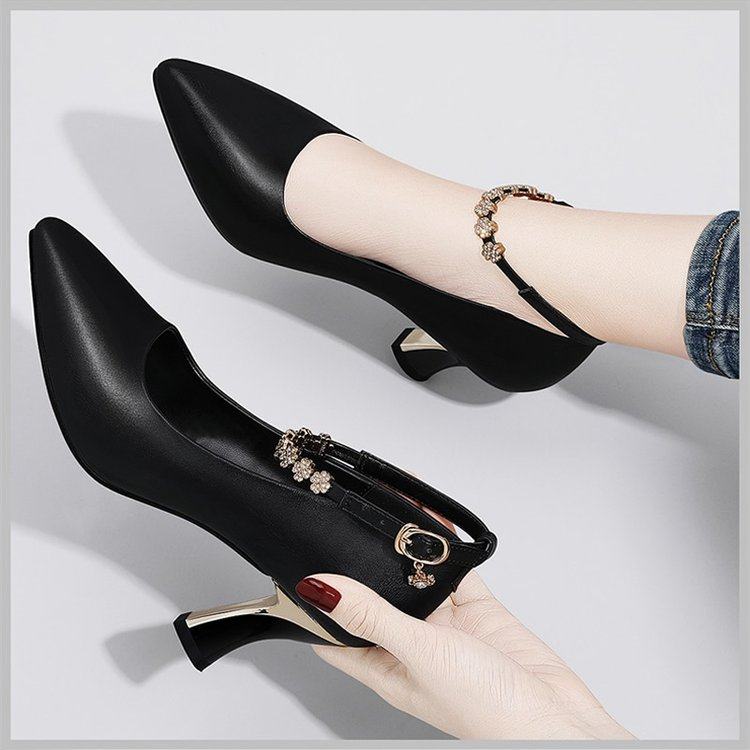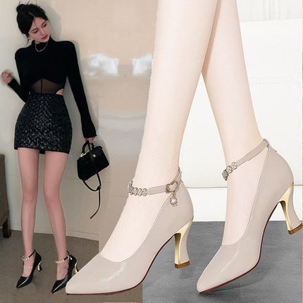 高跟鞋女粗跟真皮2022秋季细跟浅口尖头一字扣女式皮鞋中跟单鞋子