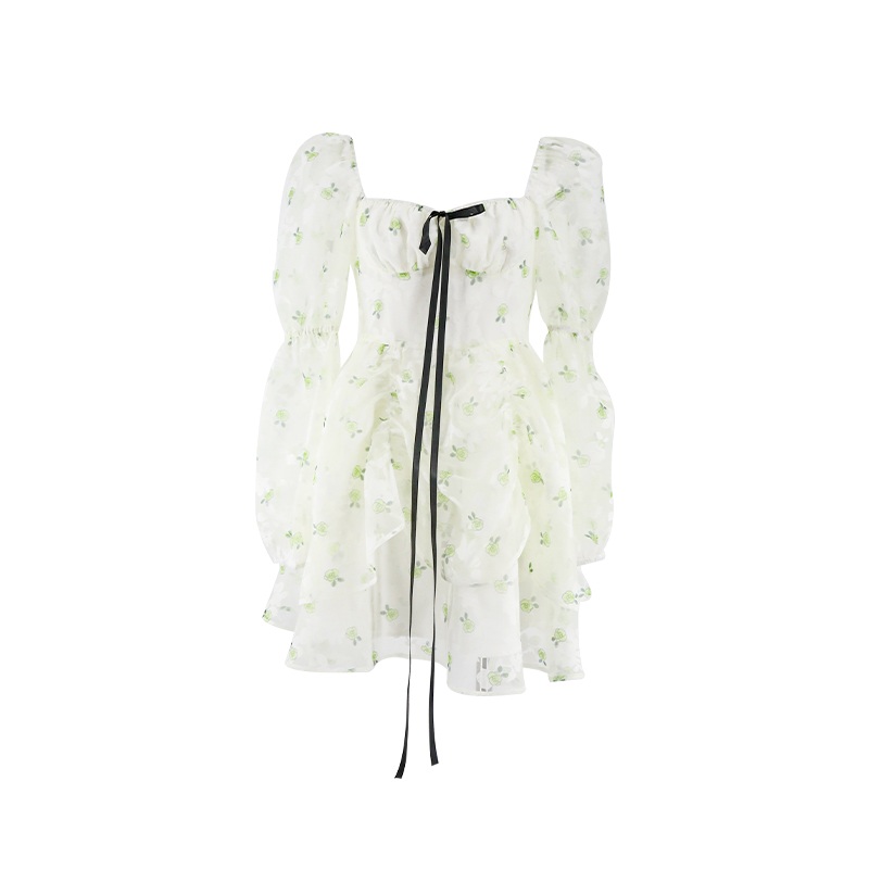 下蛋喵2022春夏清新绿色花朵烧花双层长袖绑带纱裙小礼服裙连衣裙