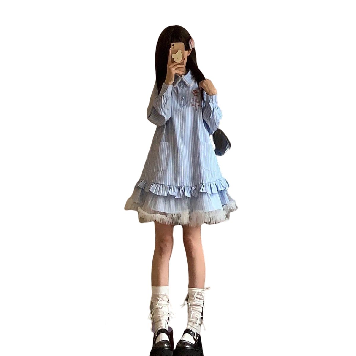 夏季日系学院风蓝色条纹衬衫连衣裙女甜美小个子蕾丝拼接蓬蓬短裙