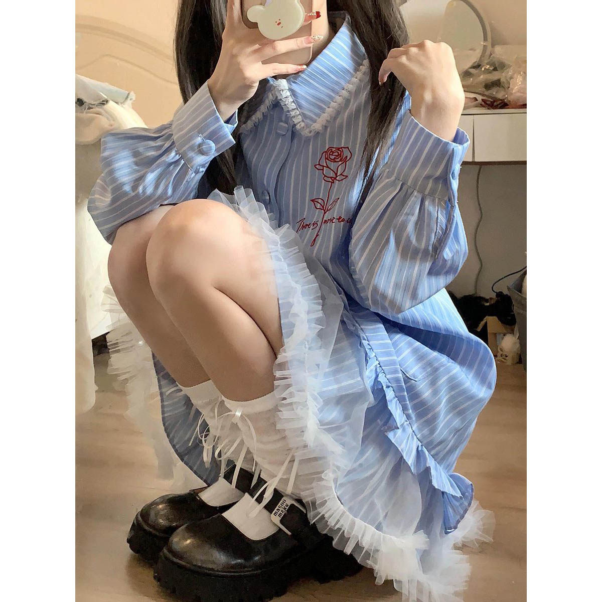 蓝色条纹蕾丝拼接衬衫连衣裙