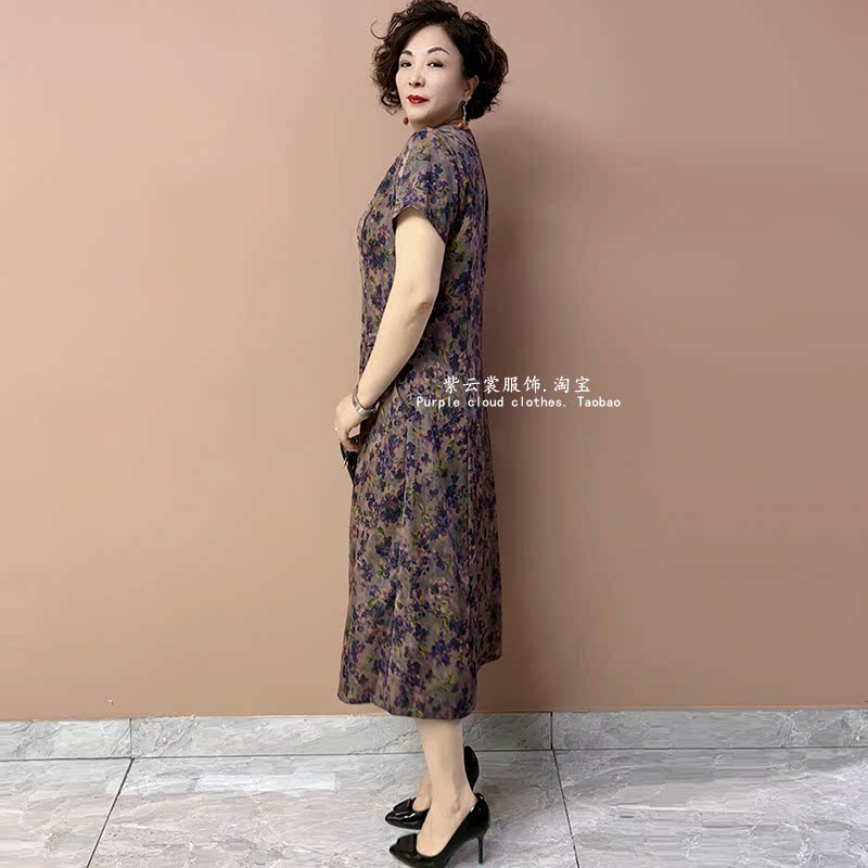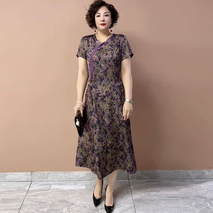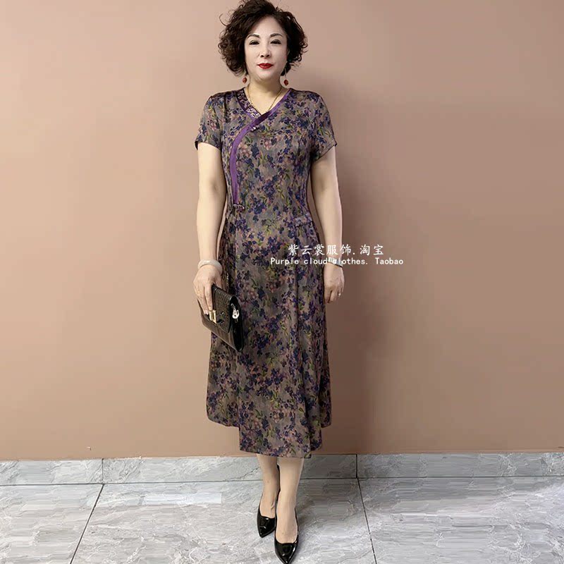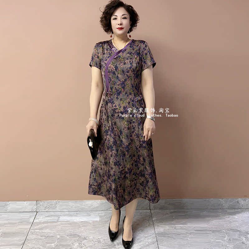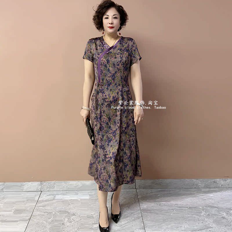 夏季妈妈V领真丝缎短袖新中式旗袍连衣裙收腰显瘦阔太太过膝长裙