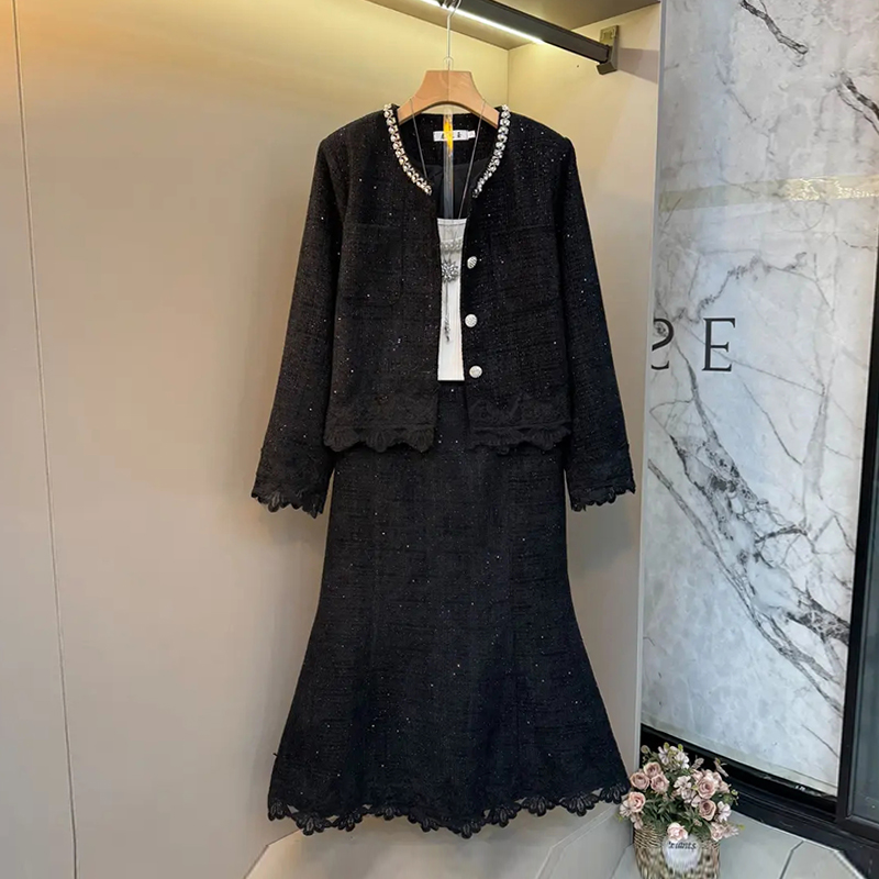 胖妹妹亮钻领蕾丝底摆长袖上衣鱼尾半身裙大码女装气质显瘦两件套