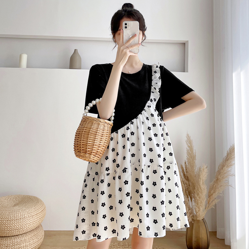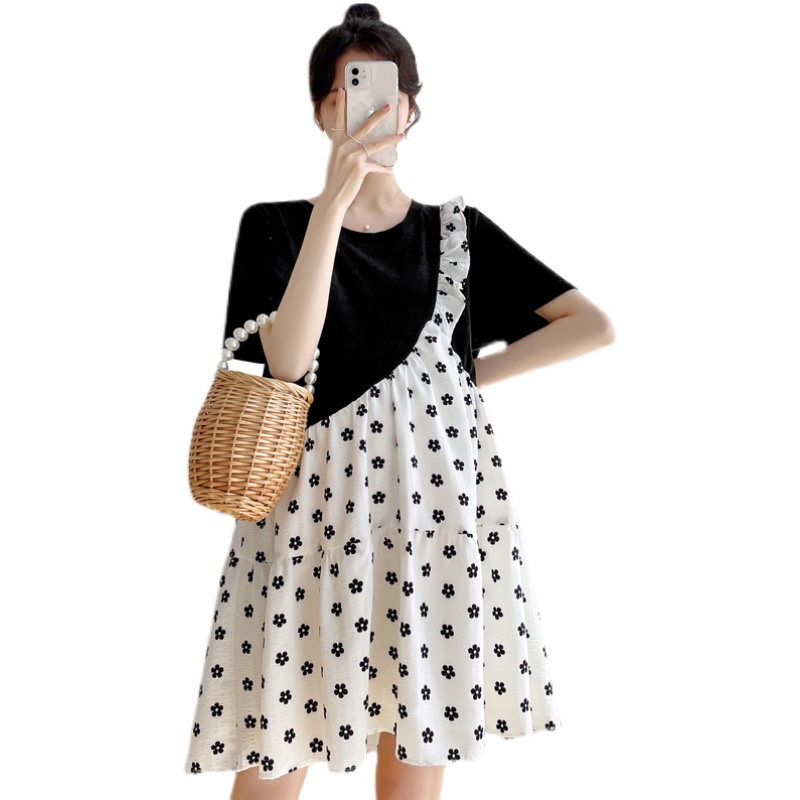 韩版宽松夏季孕妇连衣裙拼接假两件碎花A字娃娃裙甜美.小清新短裙