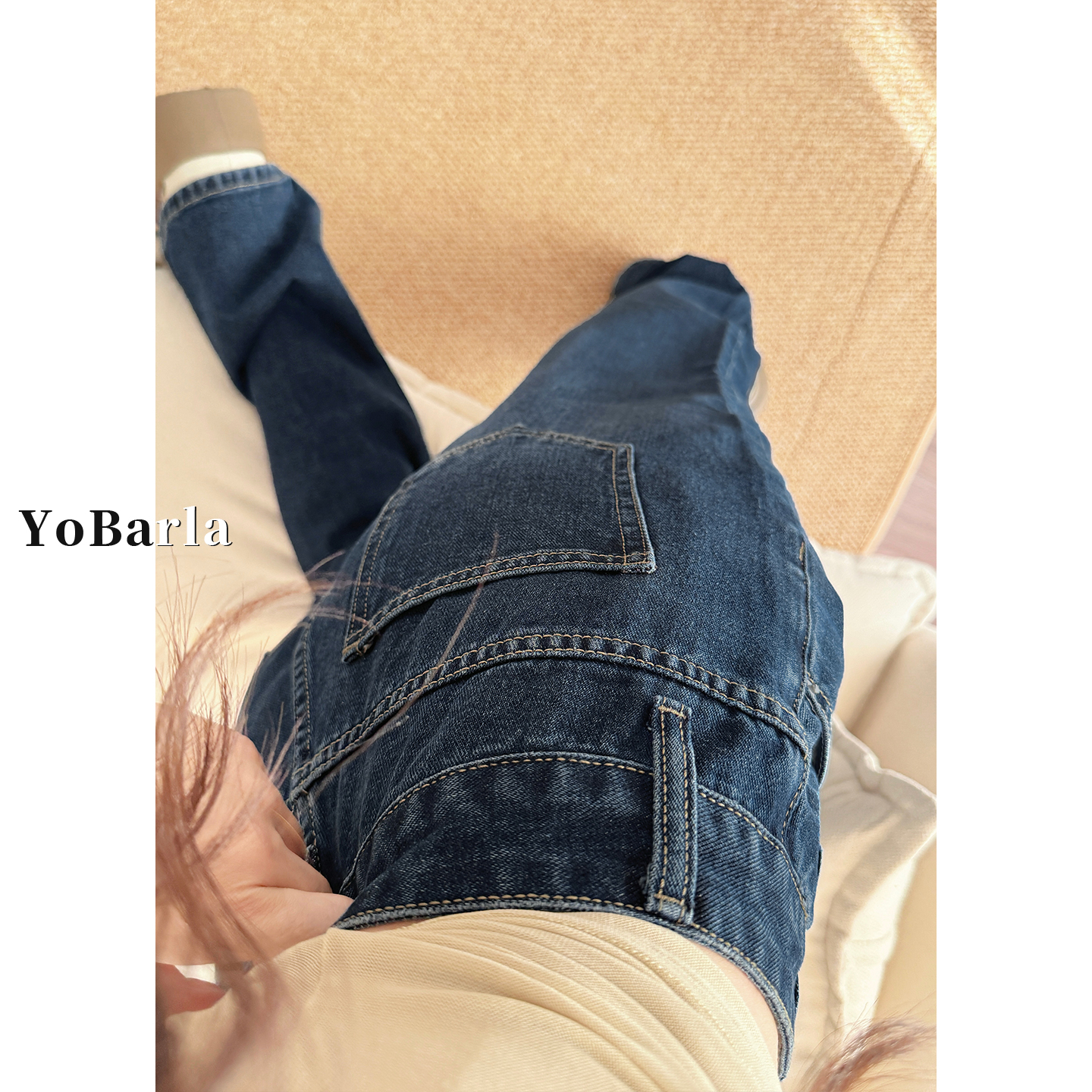 蓝灰色窄版直筒牛仔裤女秋冬加绒胖mm大码显瘦宽松梨形身材阔腿裤