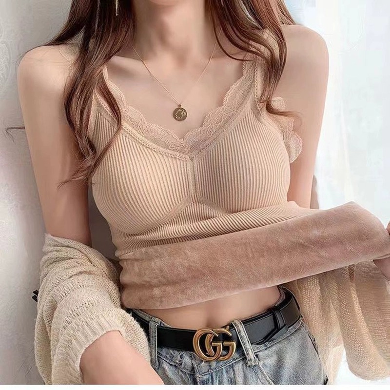 保暖加绒加厚高品质吊带背心女蕾丝带胸垫内搭修身上衣打底衫冬季