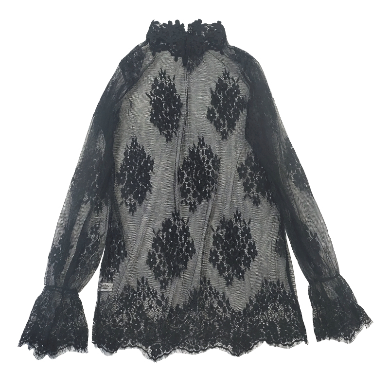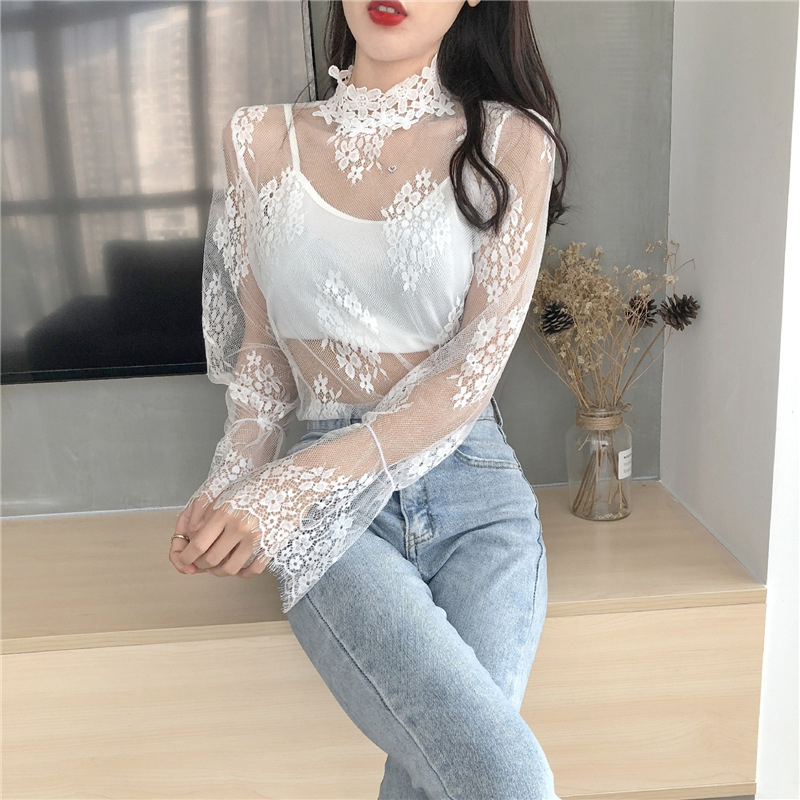 蕾丝喇叭袖打底衫女百搭洋气大码胖mm内搭网纱上衣超仙小衫纱衣潮