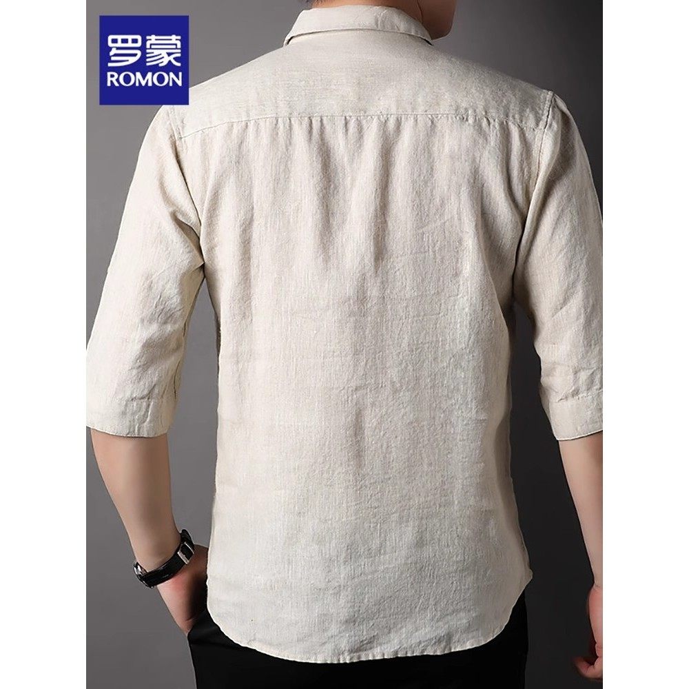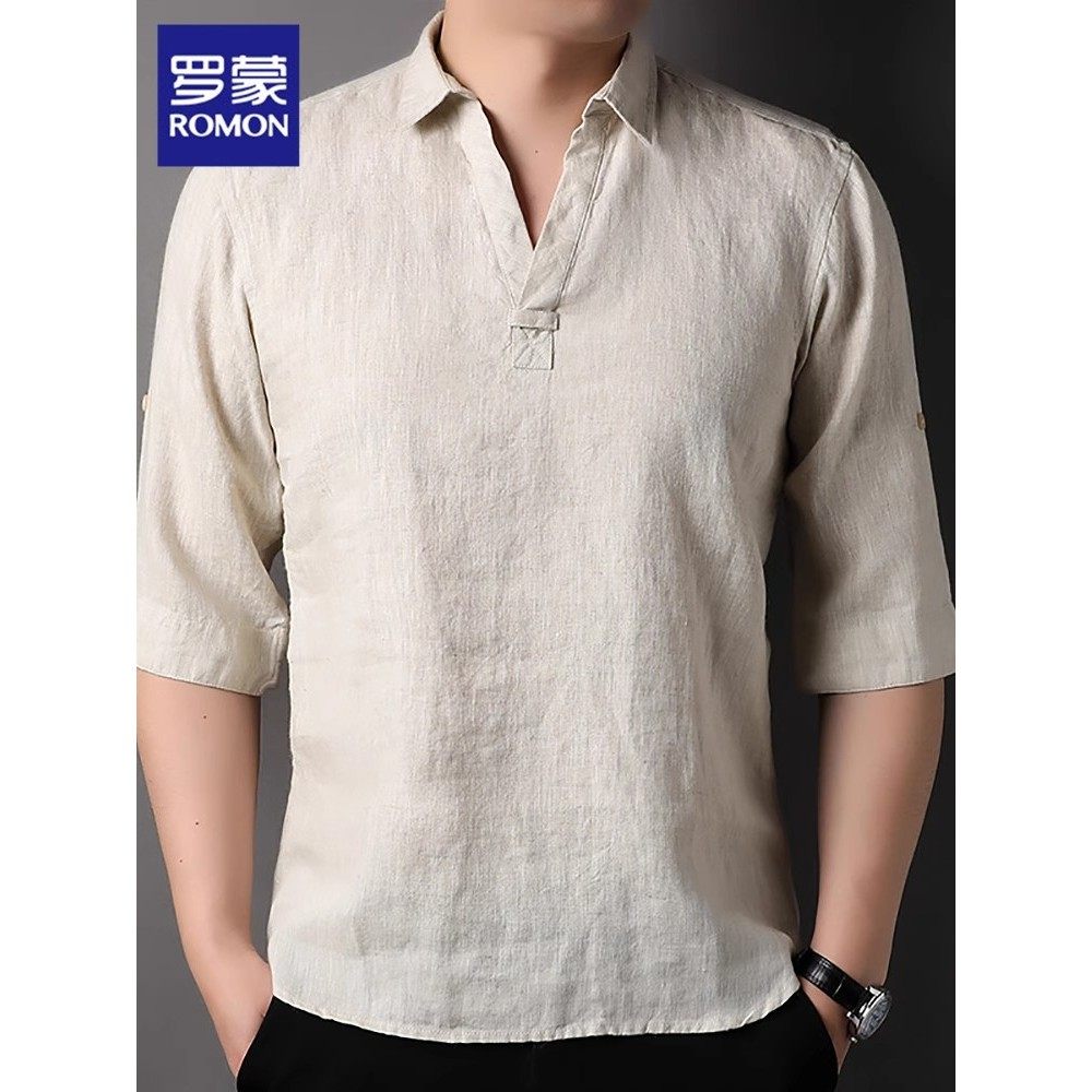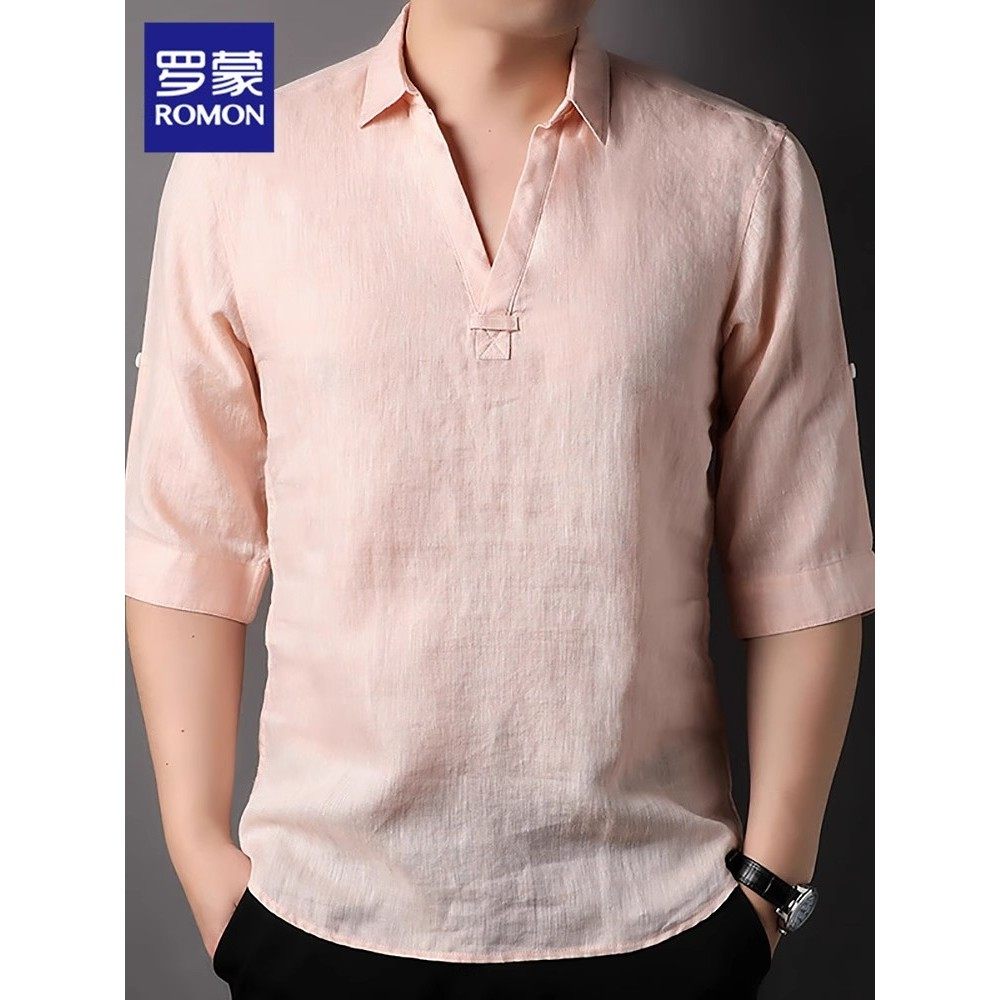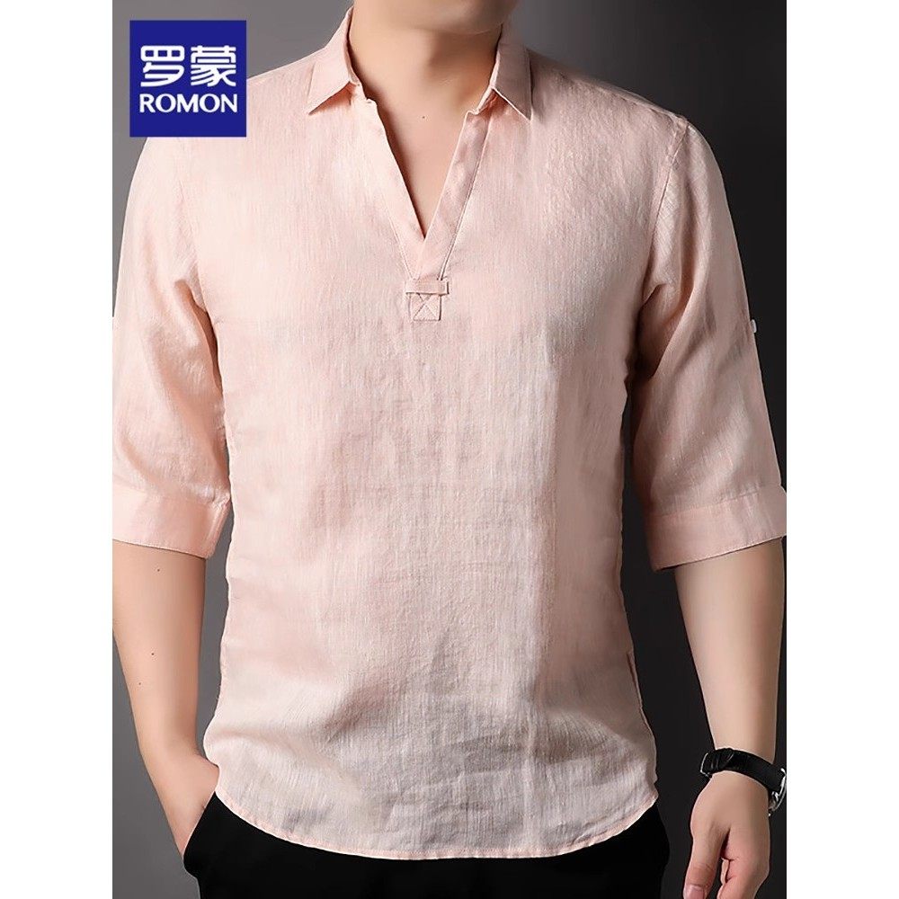 罗蒙亚麻短袖t恤男士宽松透气v领上衣2025夏季新薄款五分袖体恤男