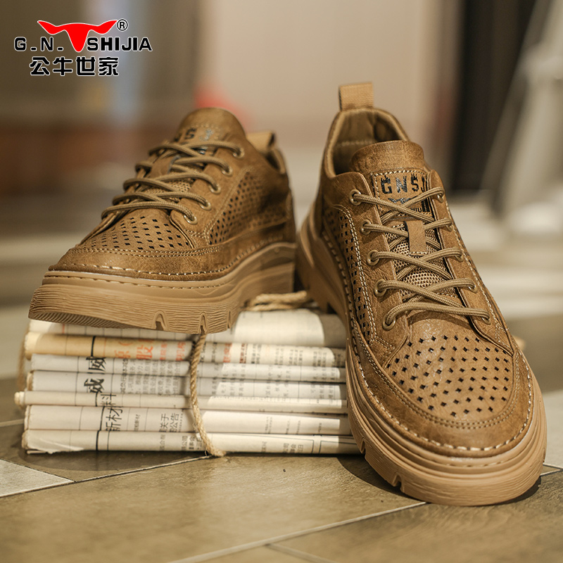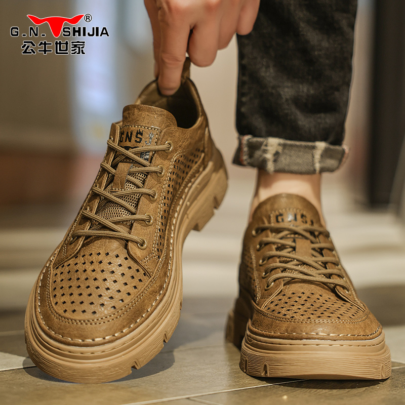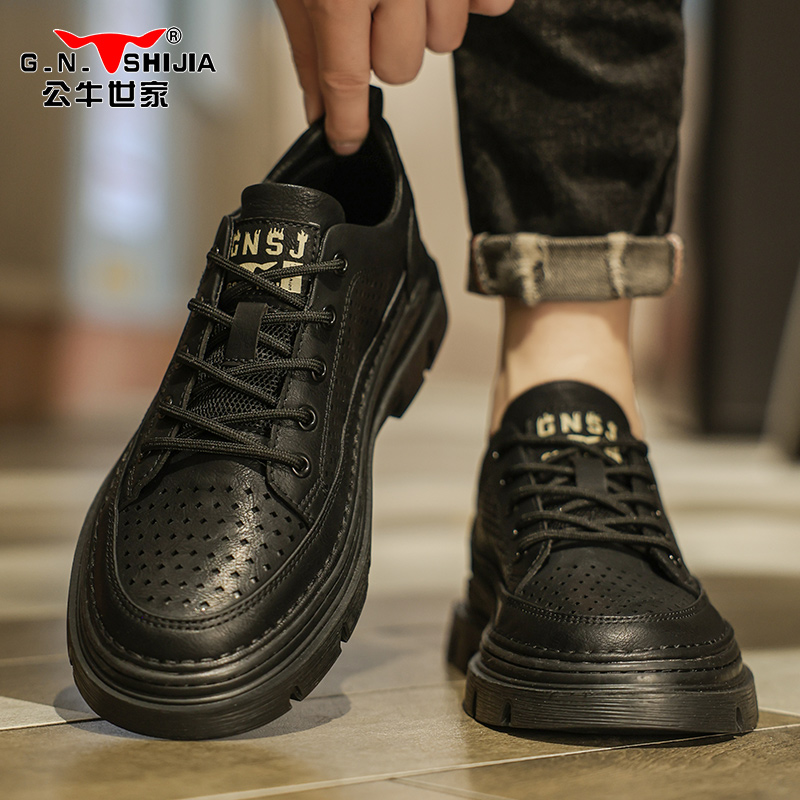 公牛世家男鞋夏季透气镂空休闲皮鞋男夏天防臭真皮英伦低帮马丁靴