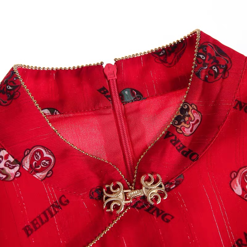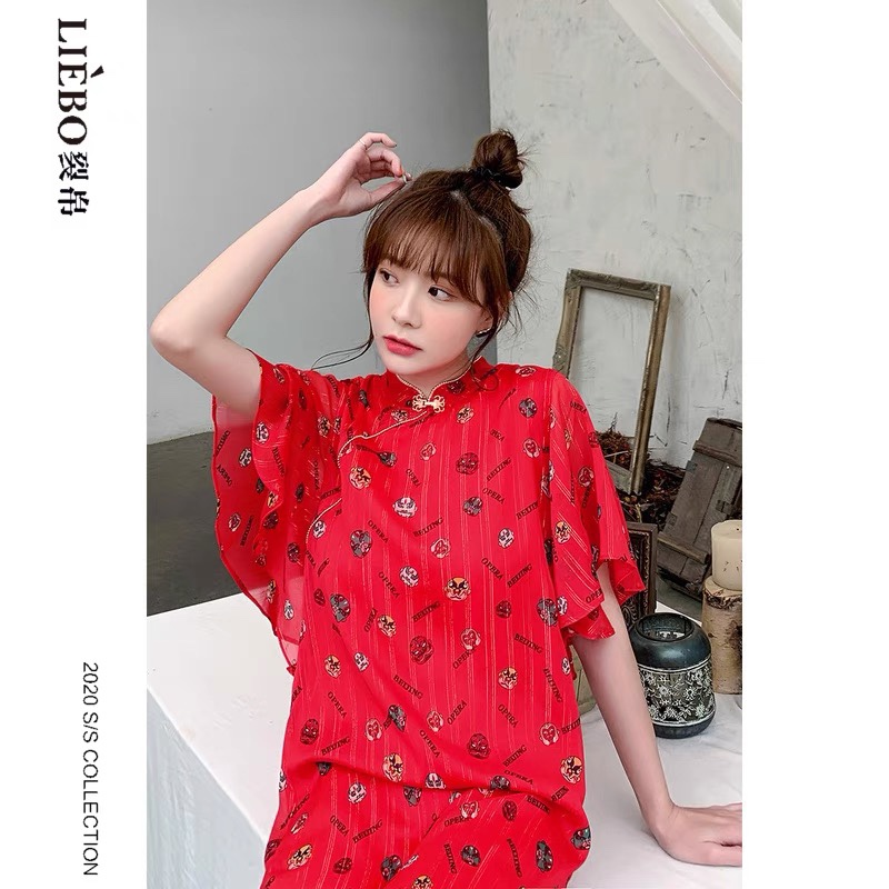 【3件6折】复古盘扣印花荷叶边雪纺中袖改良汉服旗袍连衣裙女