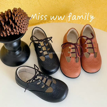 女童英伦风玛丽珍圆头系带复古镂空手工小皮鞋