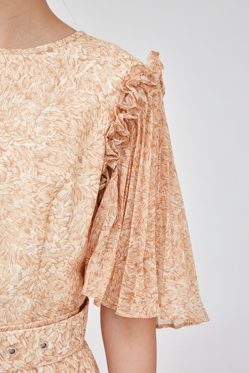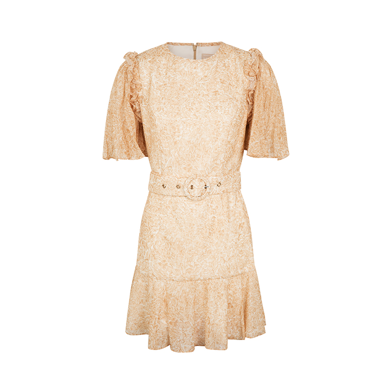 KEEPSAKE 黄色碎花木耳边袖口腰带女士短袖连衣裙