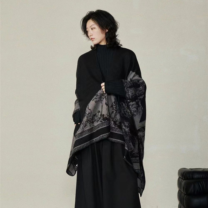 简约2025小众仿羊绒暗黑开叉斗篷秋冬保暖男女双面民族风披肩围巾