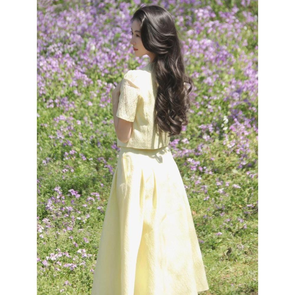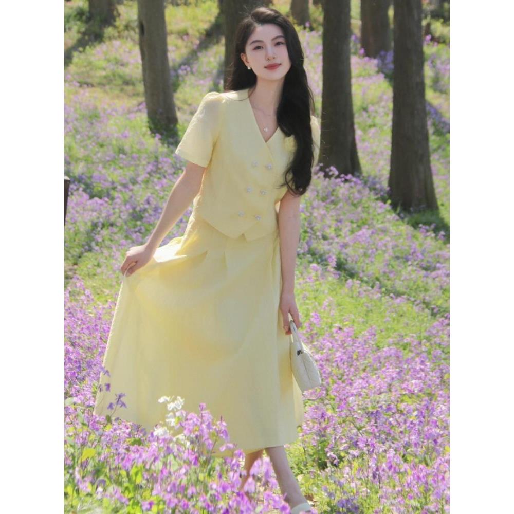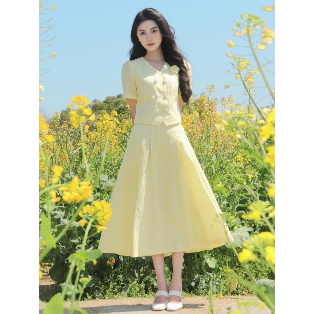 2025超火夏装一整套奶黄色小香风套装富家千金感巨好看衬衫配半裙