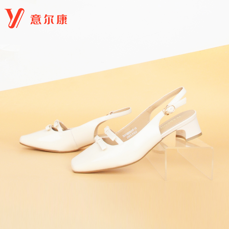意尔康女鞋2025新款夏季蝴蝶结方头粗跟一字带后空包头凉鞋女