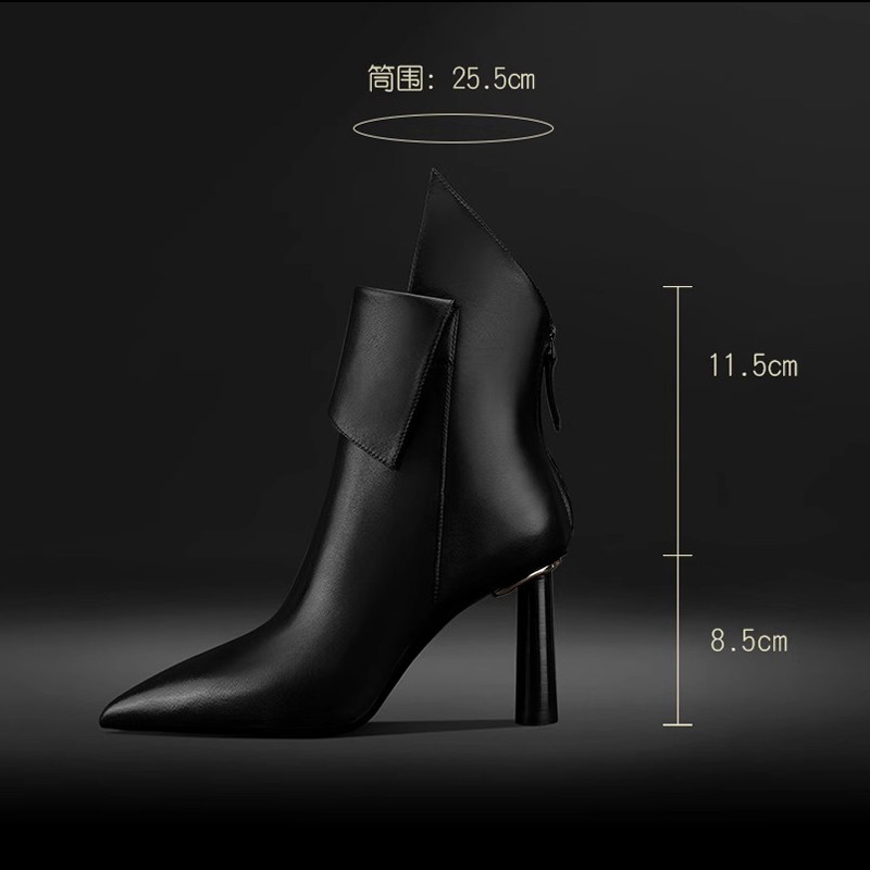 舒适软皮黑色真皮高跟鞋短靴女2025新款粗跟低筒靴小个子女靴气质