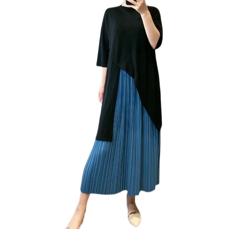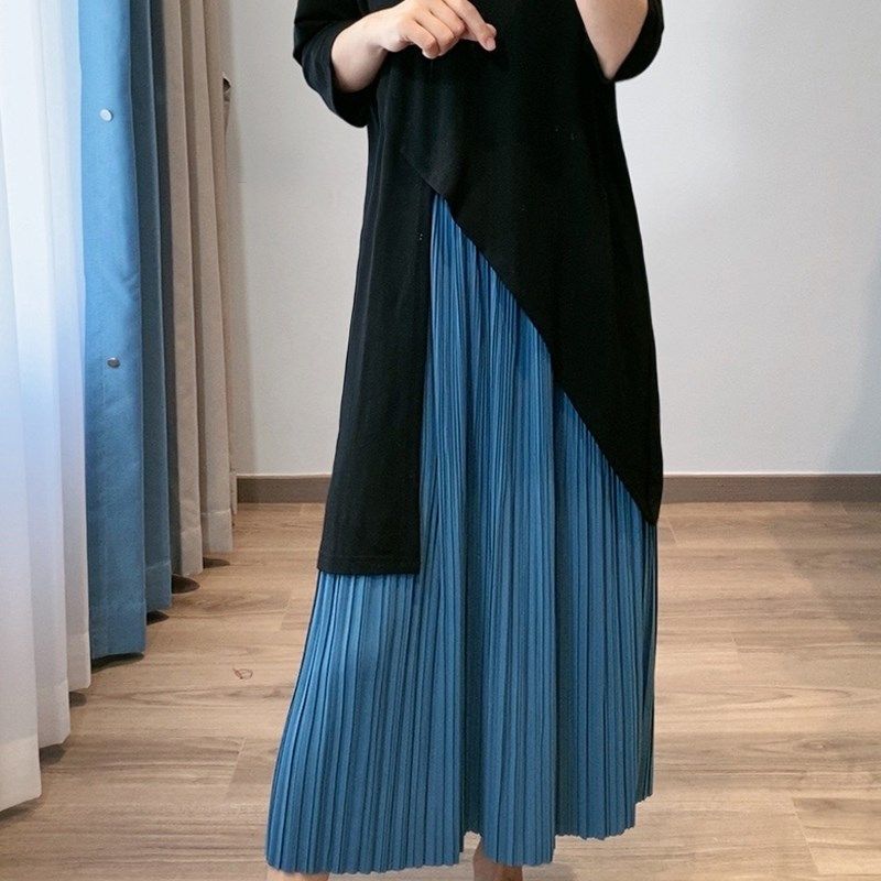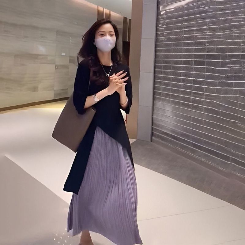 高品质 微胖mm显瘦遮肉连衣裙两件套装夏装女中长款T恤百褶半身裙