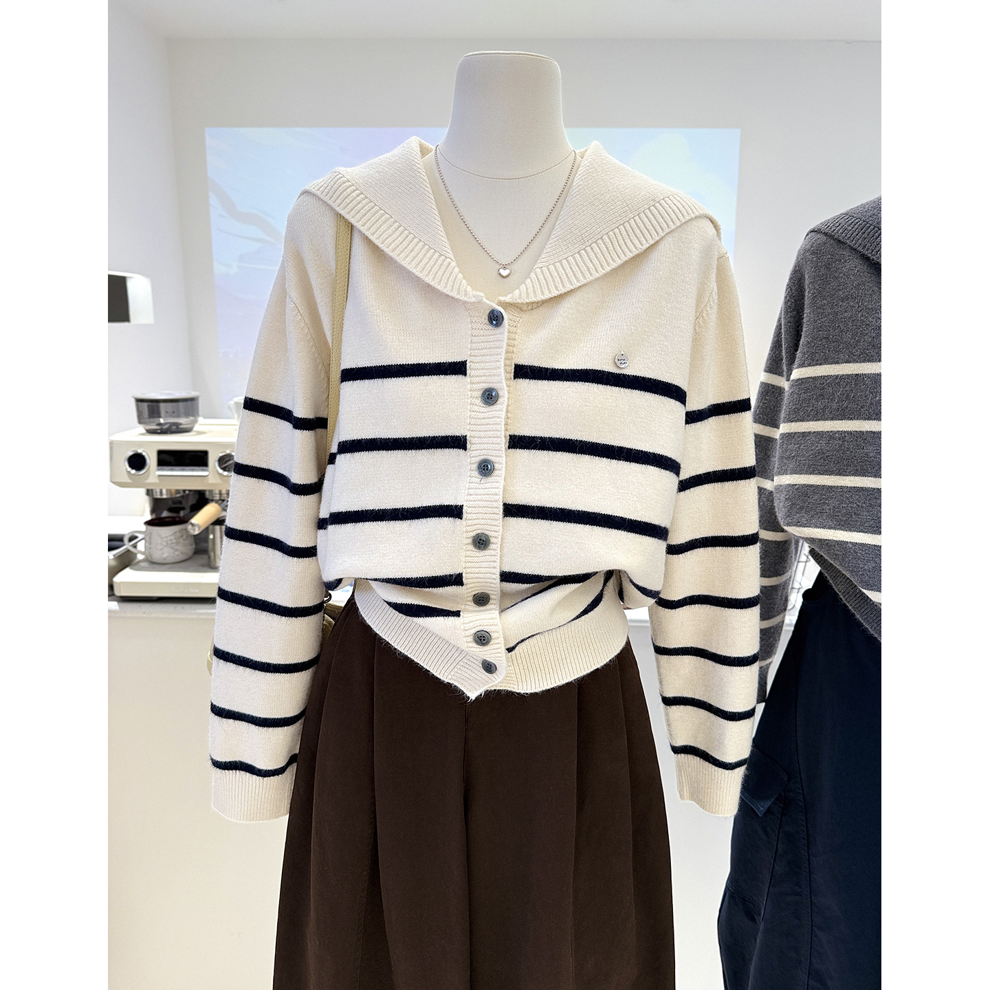 秋季新款韩版经典百搭减龄海军领撞色条纹针织衫开衫毛衣女外套