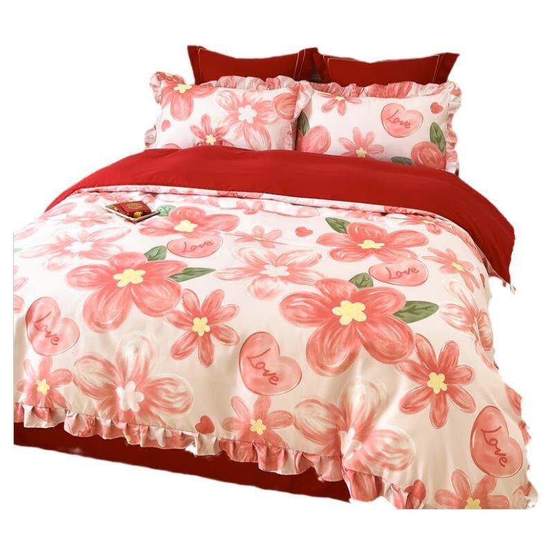 小红花印花婚庆四件组红色新婚被套婚房床单结婚床上用品婚礼陪嫁