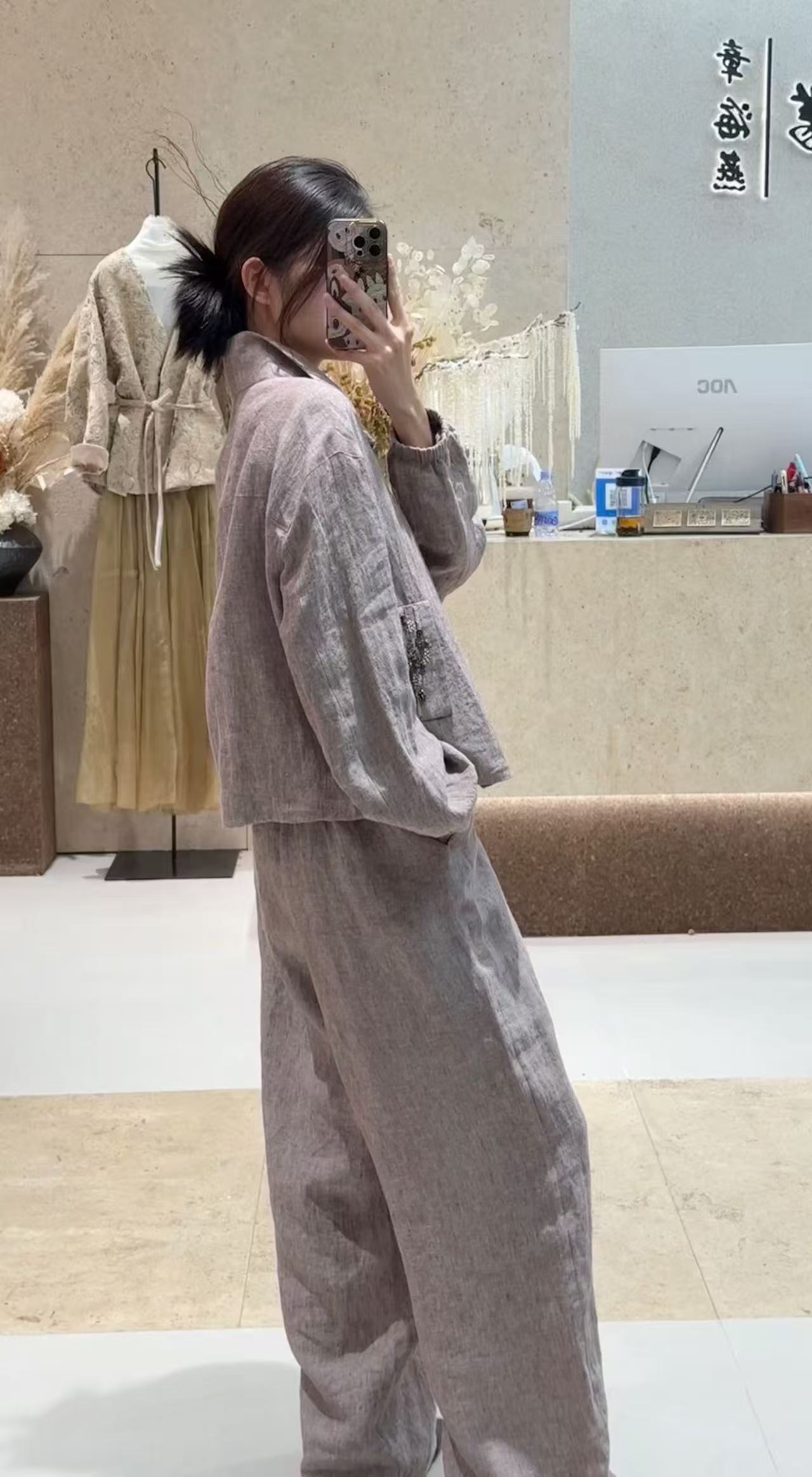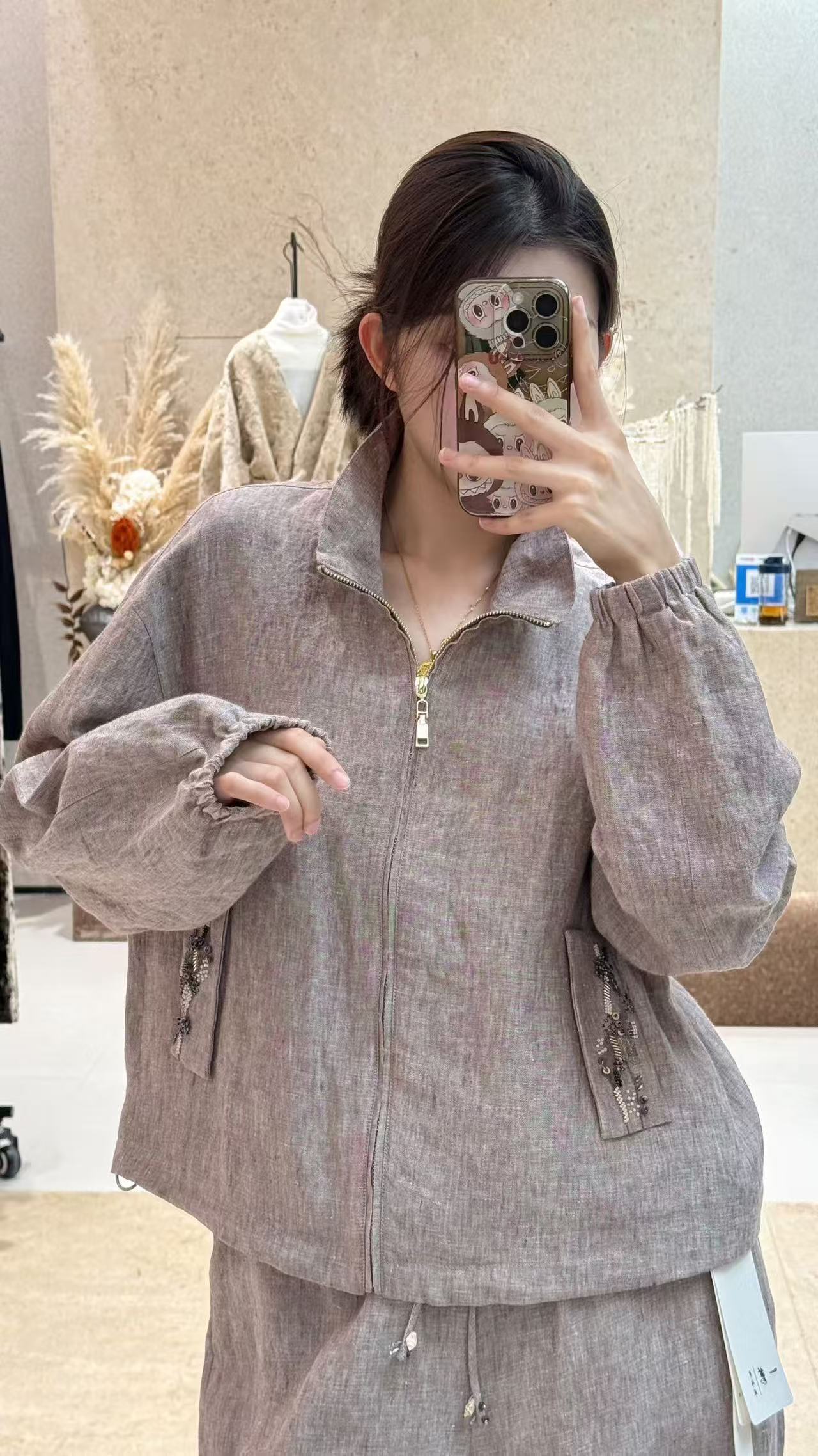 海燕家新款 休闲松弛钉珠夹克阔腿裤100亚麻套装W862K502