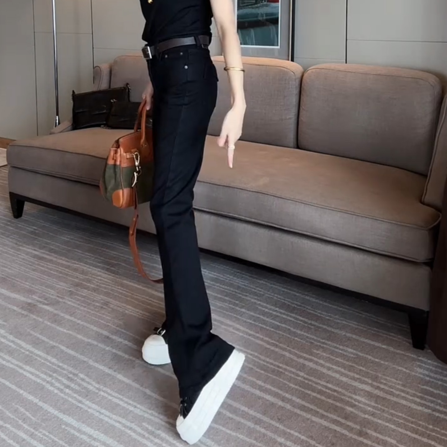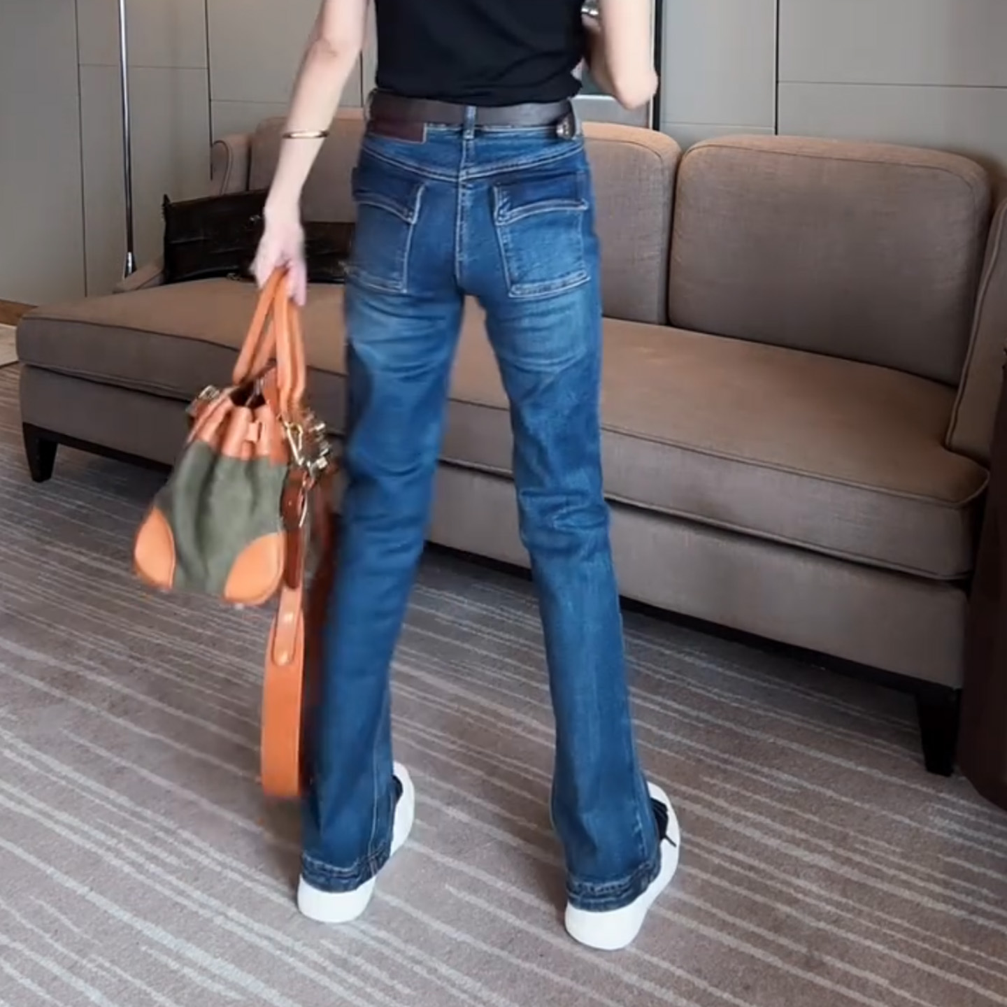 大码高腰弹力大长腿窄窄马蹄裤遮胯喇叭裤女秋胖mm显瘦微喇牛仔裤