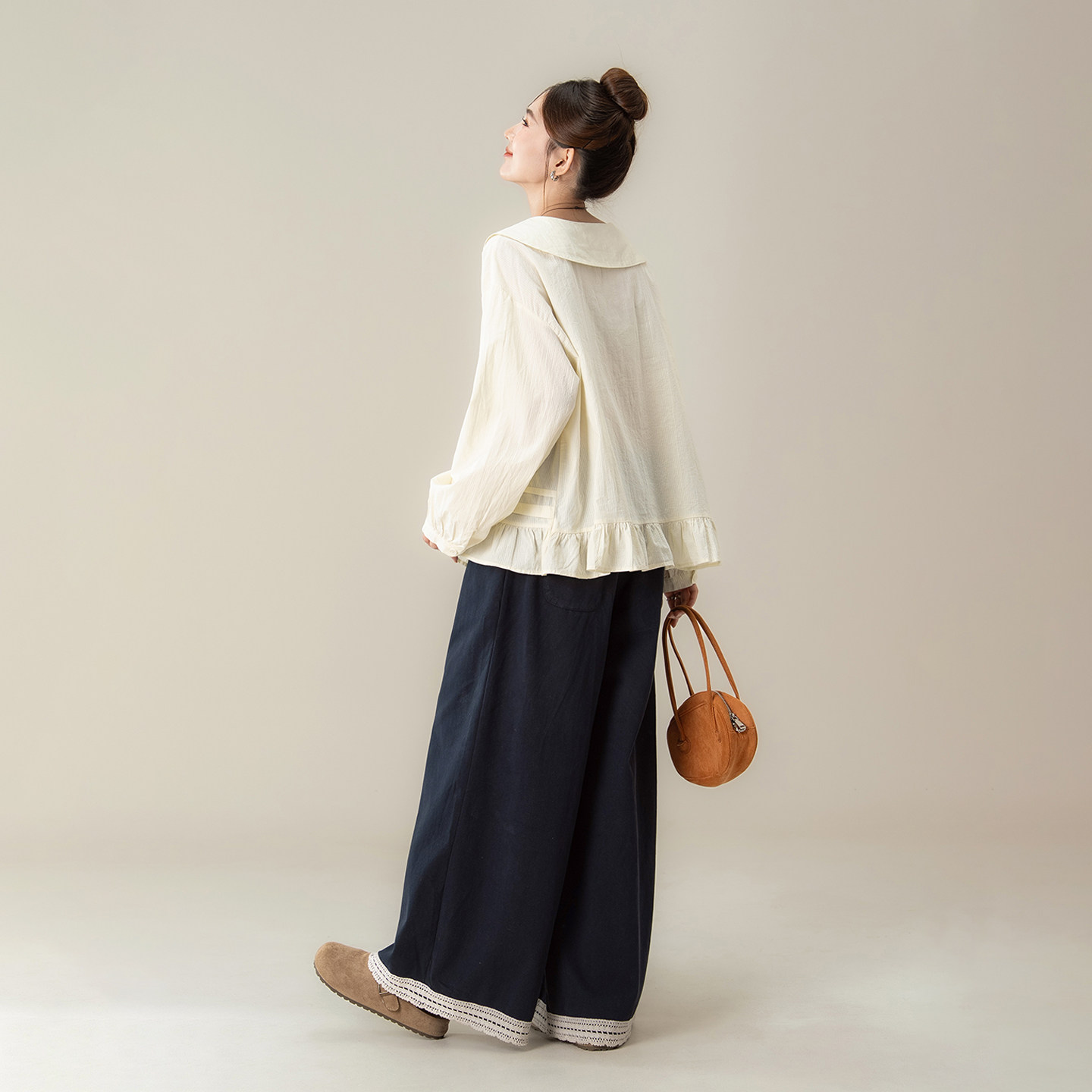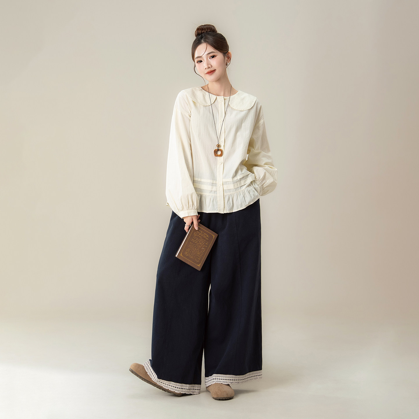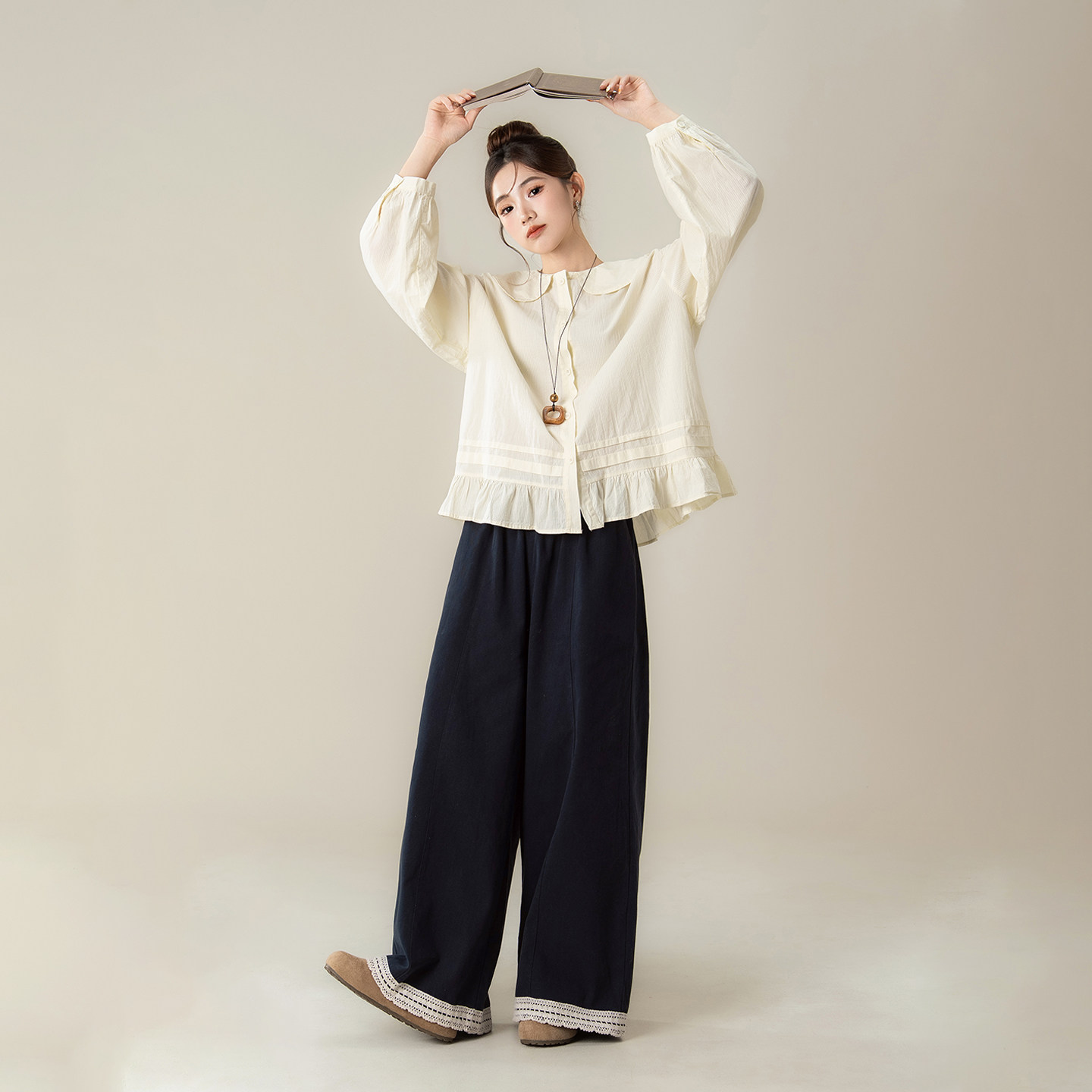 杏色娃娃领长袖衬衫女春季新款日系文艺风复古压褶设计感宽松上衣