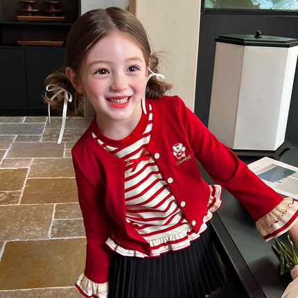 栀了成长记女童装韩版条纹假两件T恤秋季新款儿童宝宝荷叶边上衣