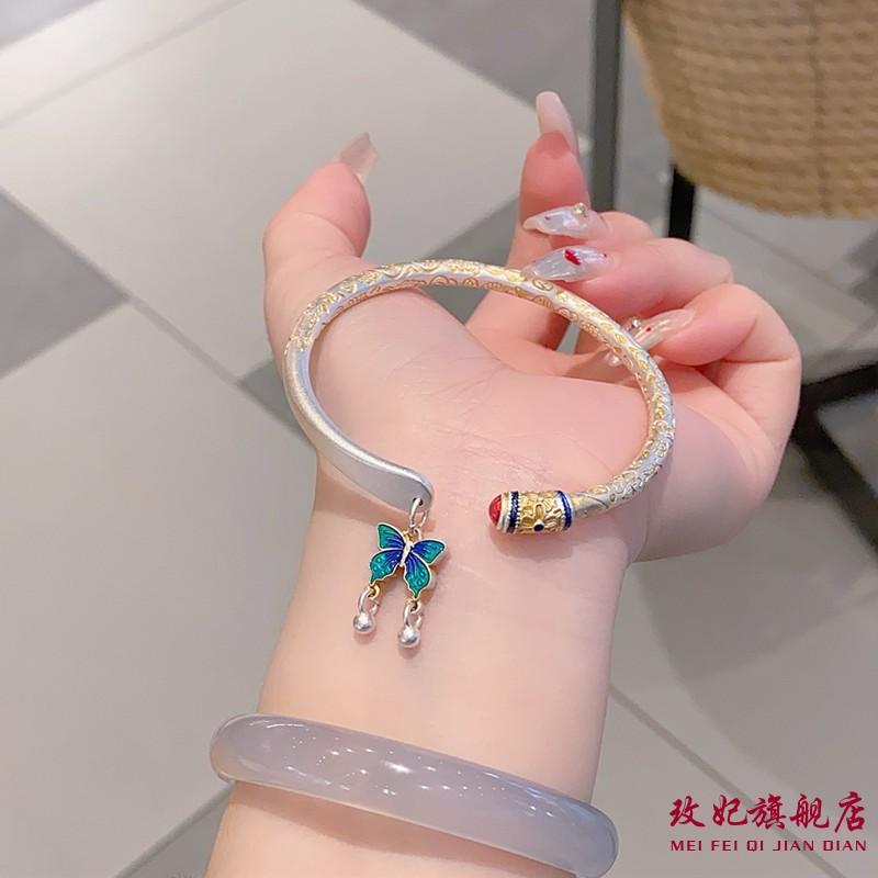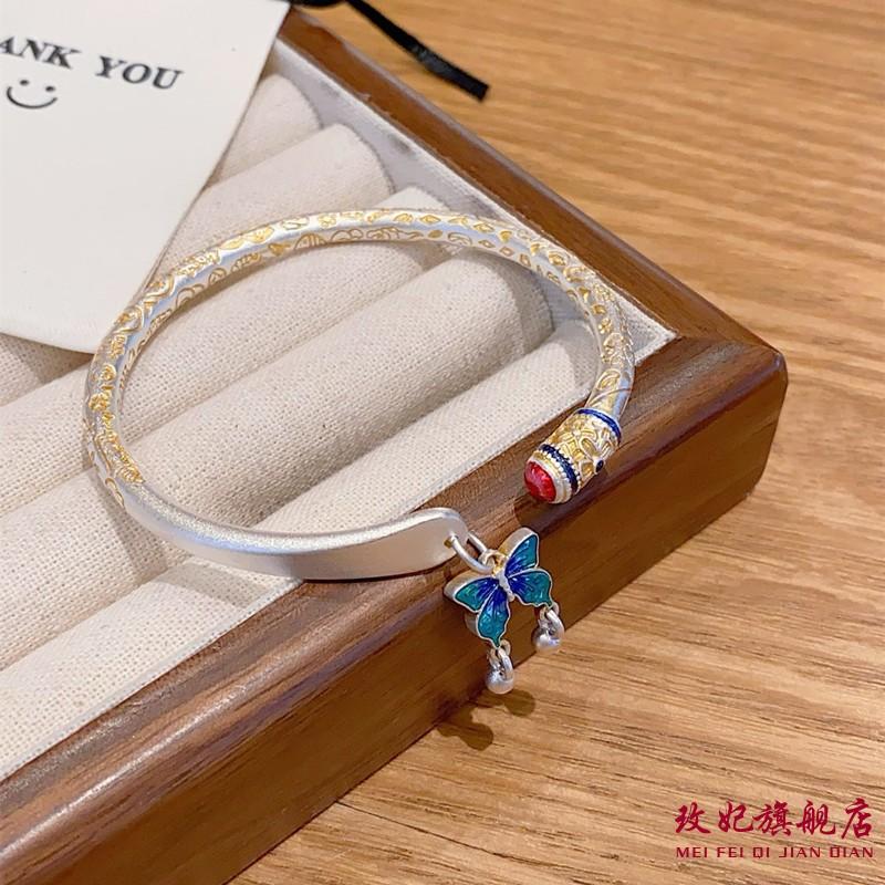 玫妃正生吉言描金蝴蝶莲花莲蓬开口纯银手镯足银9999女百搭时尚