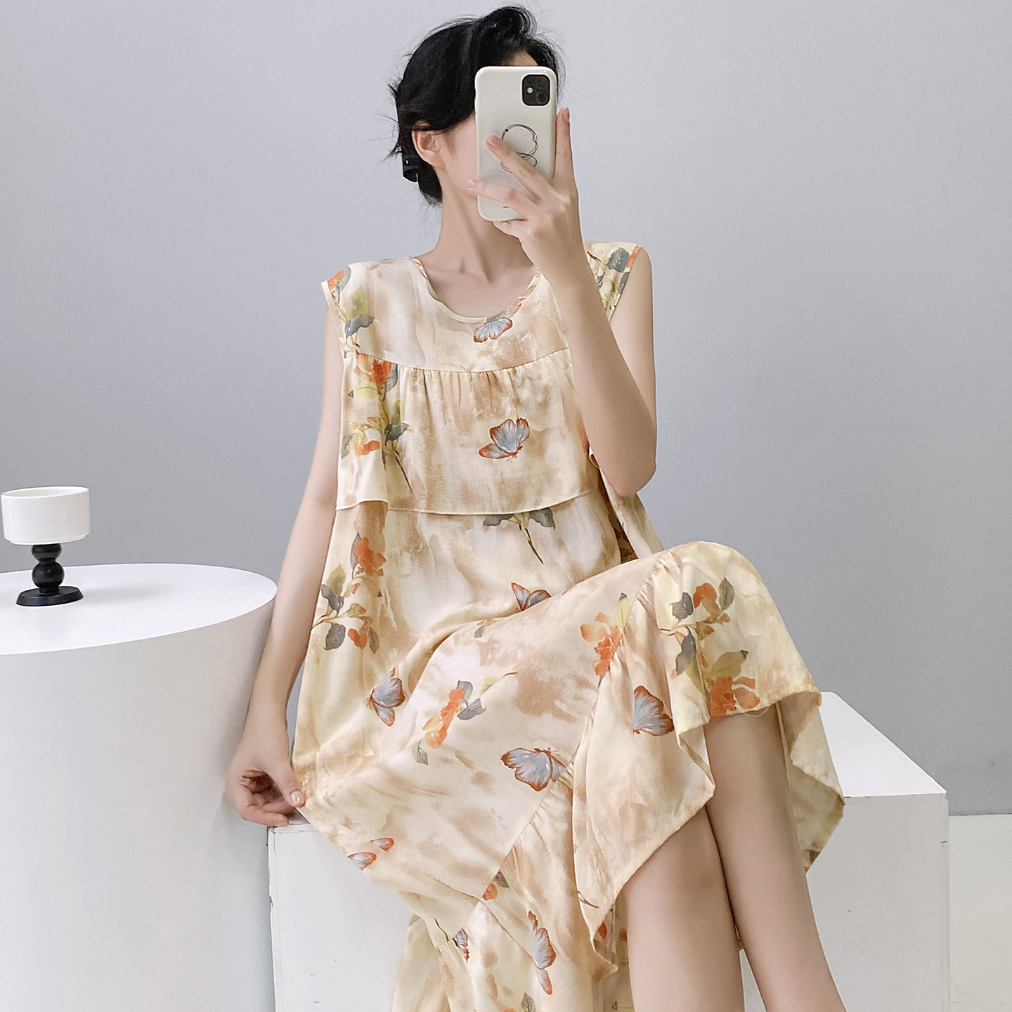 棉绸睡裙夏季薄款无袖防凸点连衣裙国风大码人造棉睡衣外穿家居服