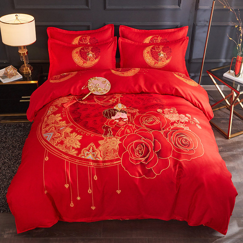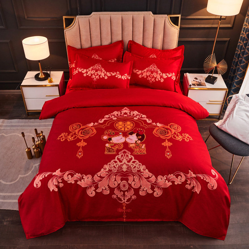 婚庆四件套结婚床单被套喜被卡通全棉大红色新婚喜庆床上用品