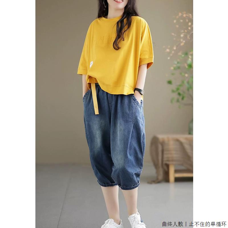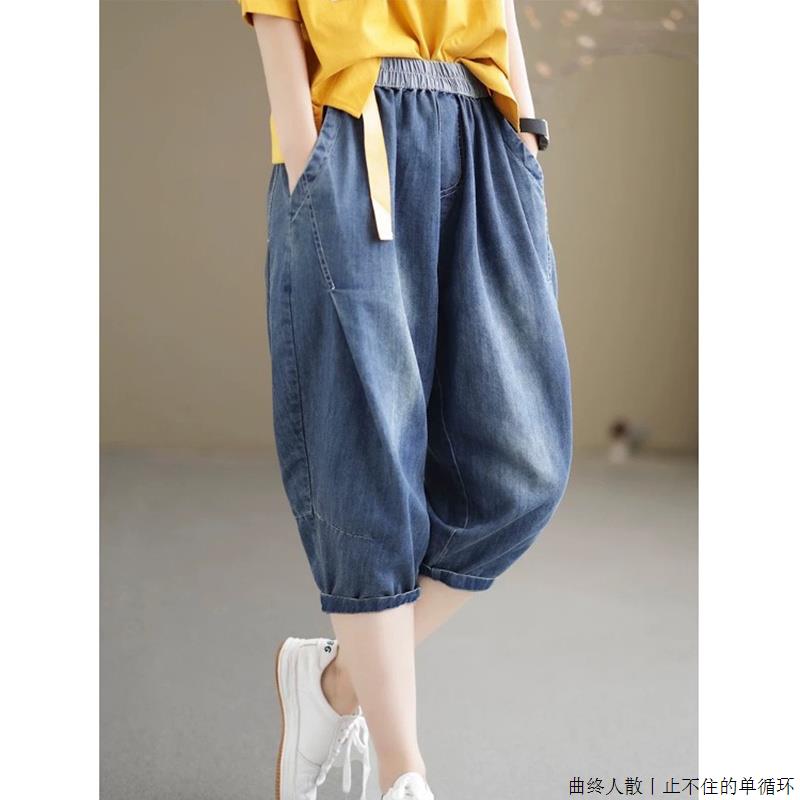 2025年夏季新款复古高腰牛仔哈伦裤女大码宽松百搭显瘦休闲七分裤