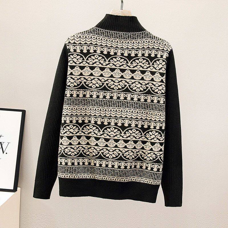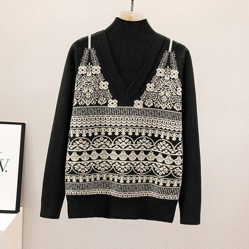 大码女装【80-200斤】假两件提花毛衣女秋冬半高领气质针织上衣衫