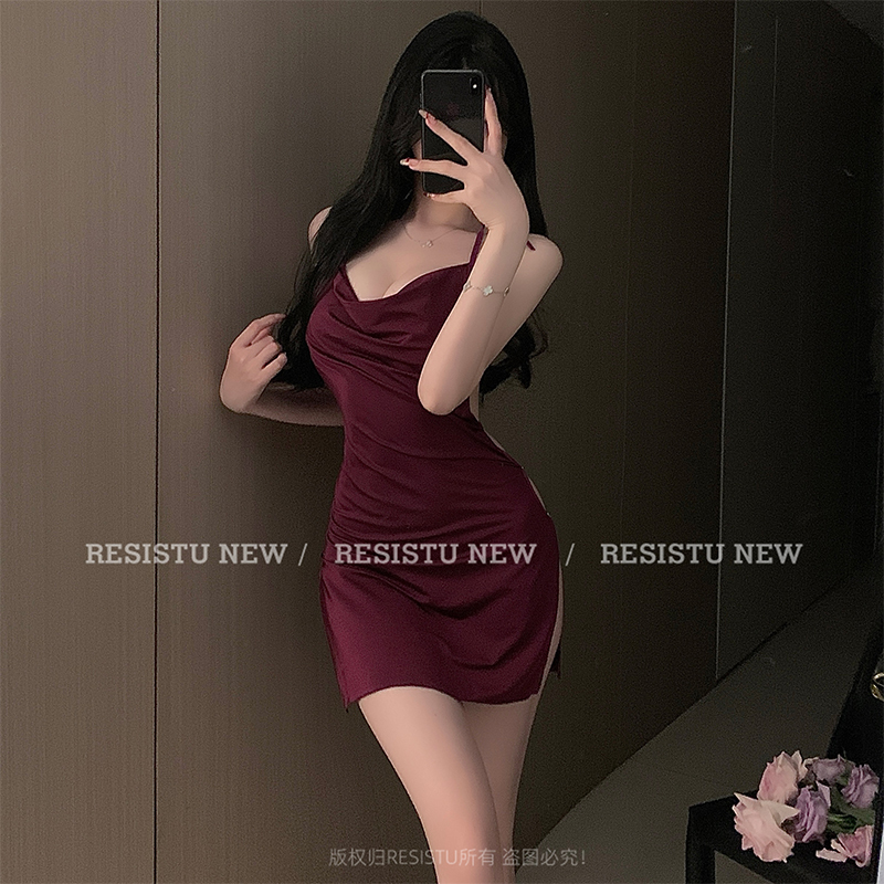 RESISTU2025春季夏红吊带裙性感睡衣女御姐风露背挂脖包臀短睡裙