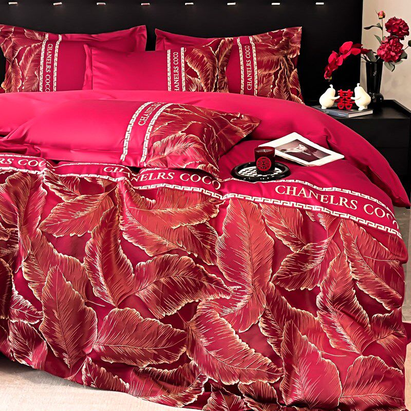 中式结婚四件套红色被套100S长绒E棉纯棉被罩婚庆陪嫁床单床上用