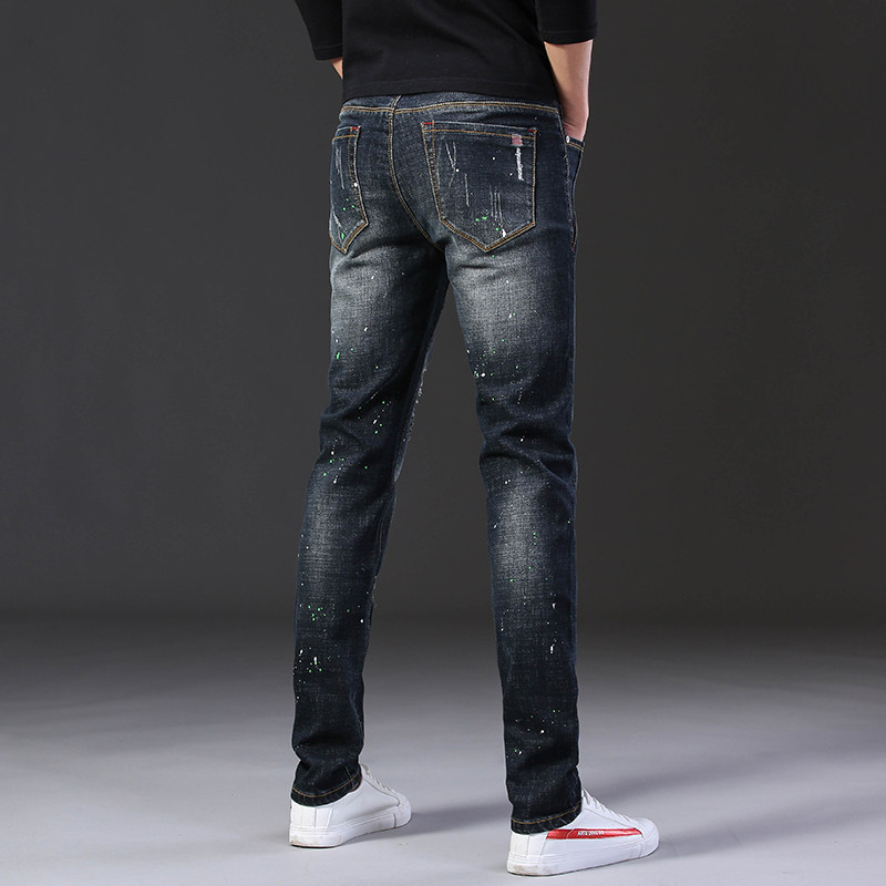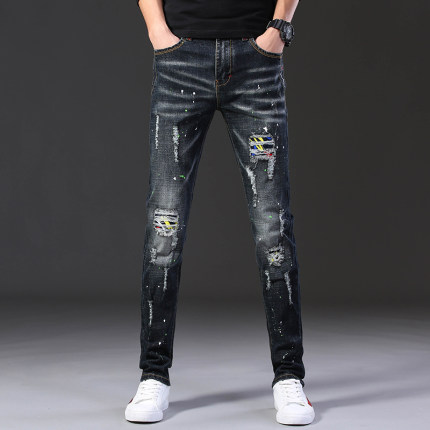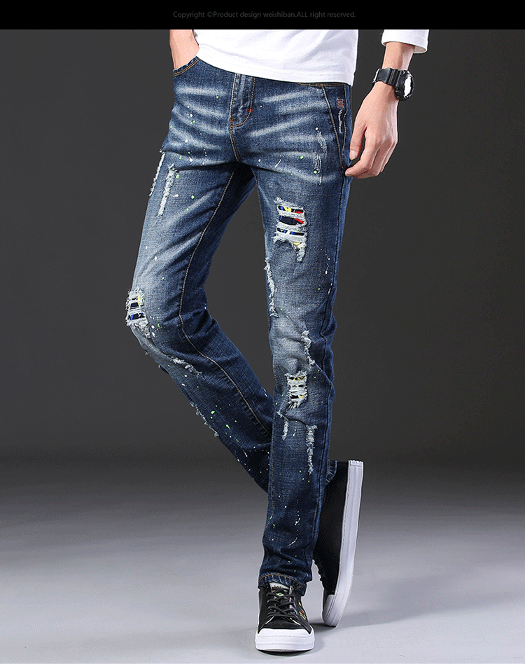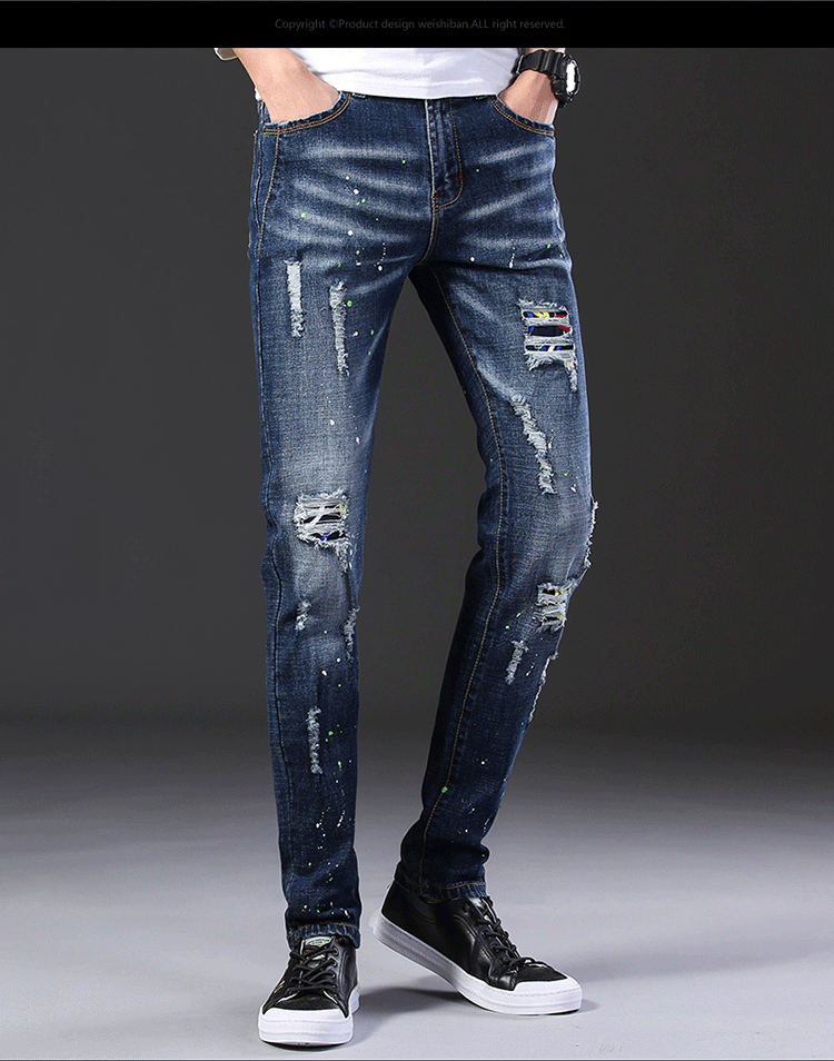 2025男装韩版春秋季蓝色油漆点泼墨破洞补丁潮男修身小直筒牛仔裤