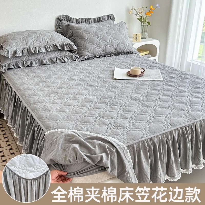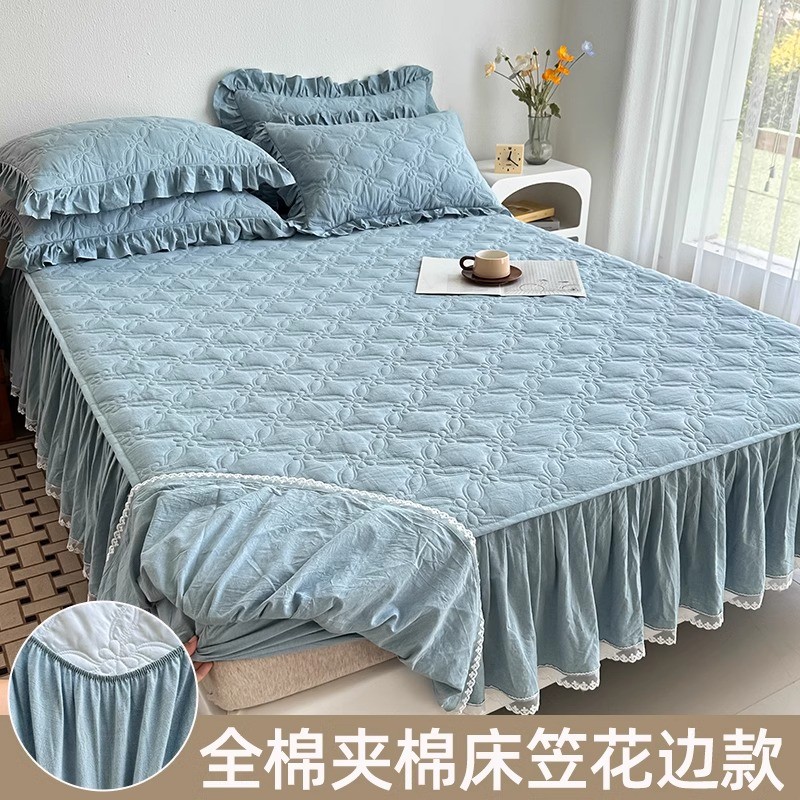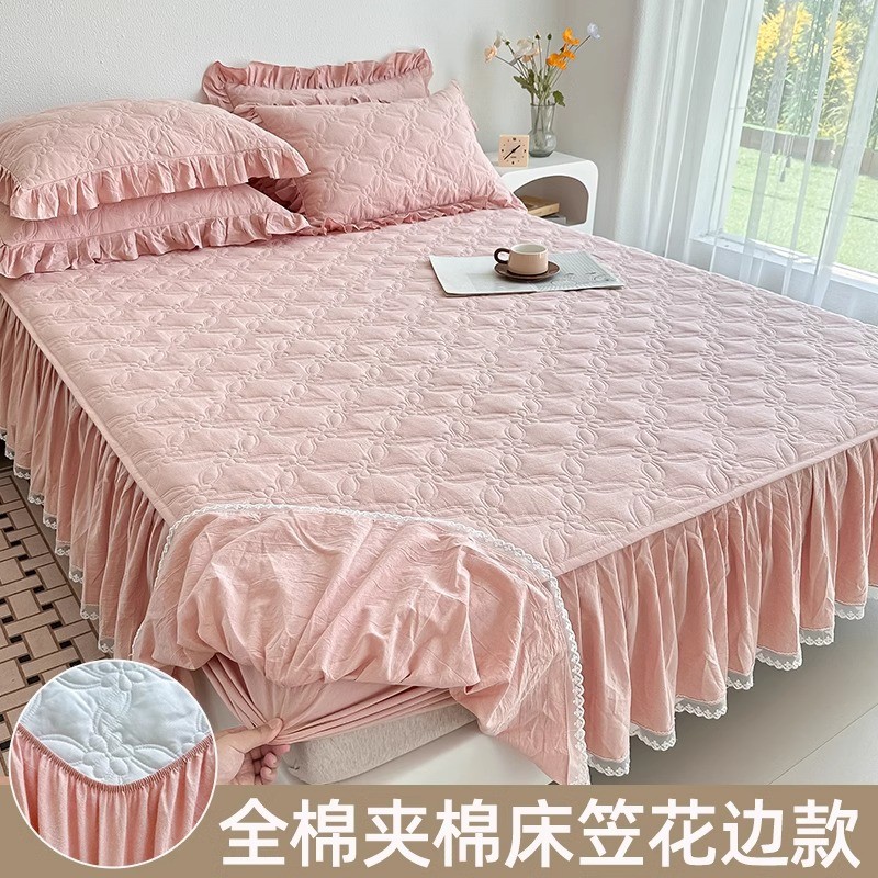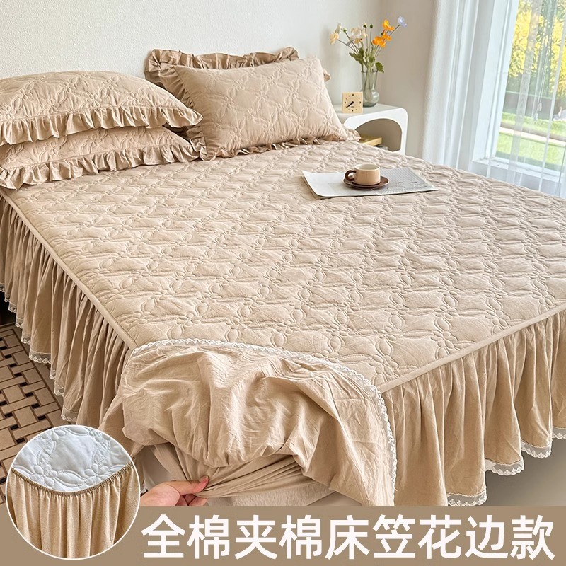 全棉夹棉床笠公主风裙边单件带加厚纯水洗棉防滑床罩垫套四季通用
