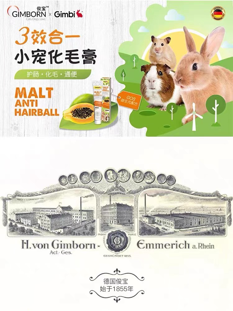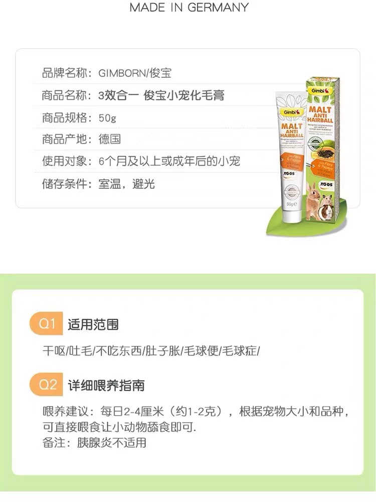 27.2德国俊宝Gimborn俊宝木瓜酵素化毛膏50g兔子仓鼠龙猫排毛