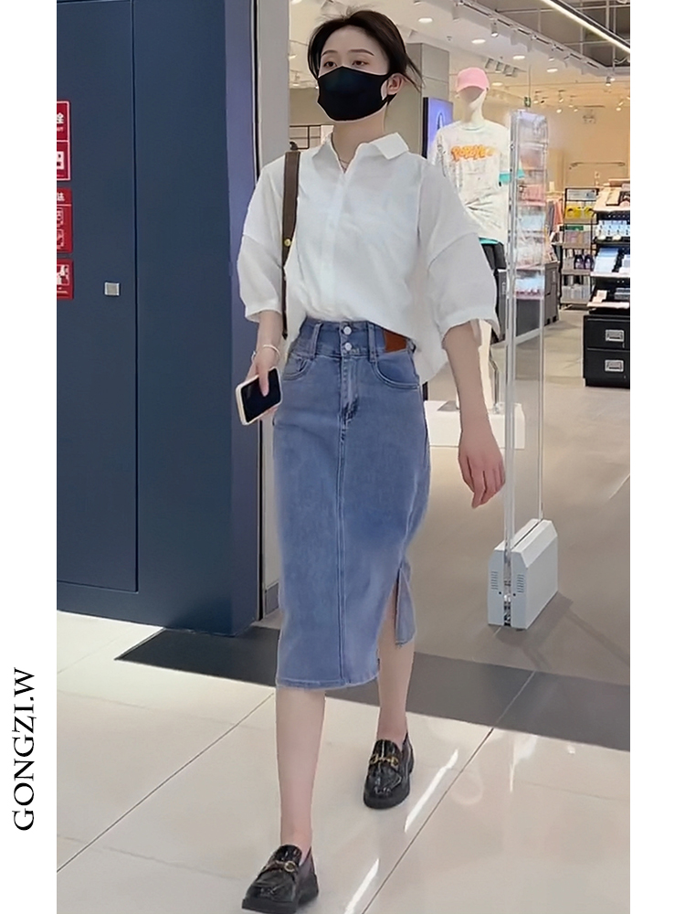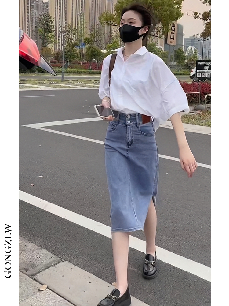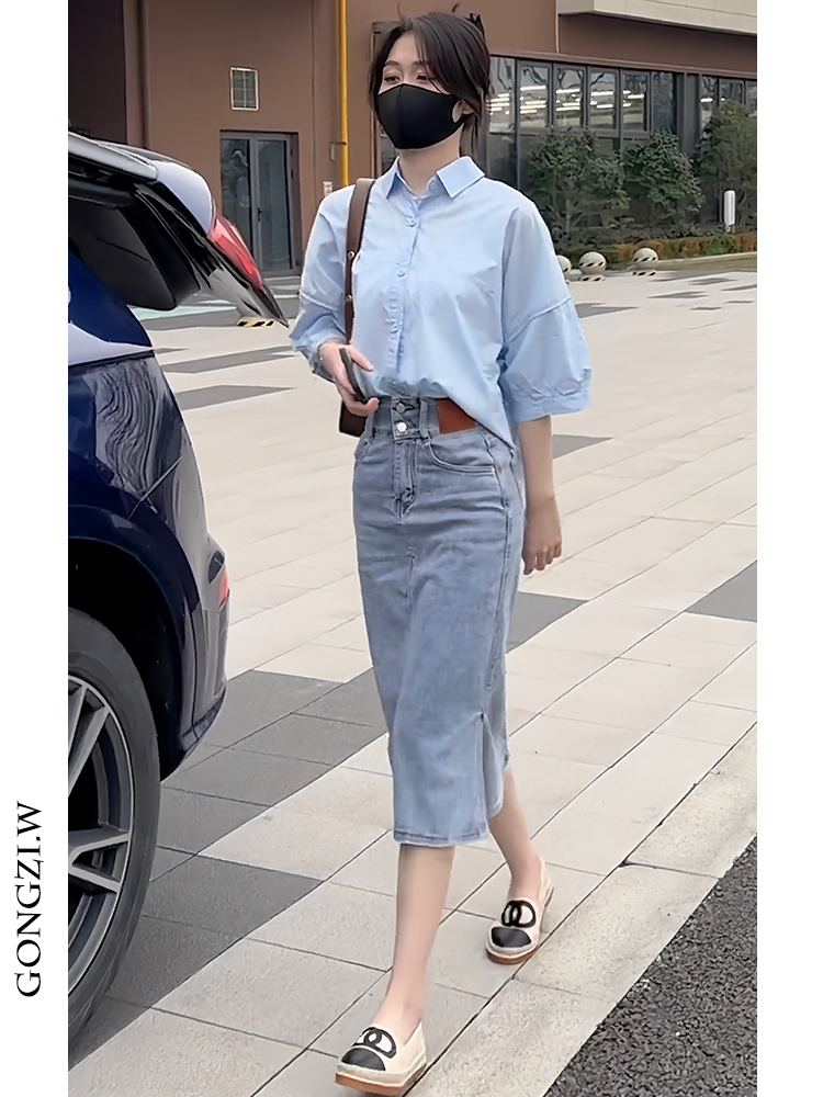 盐系轻熟两件套高级感时尚减龄百搭气质衬衫女开叉牛仔半身裙套装