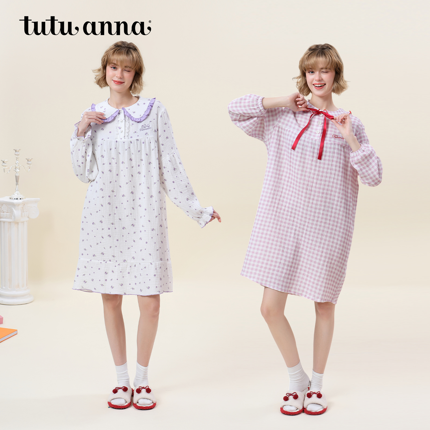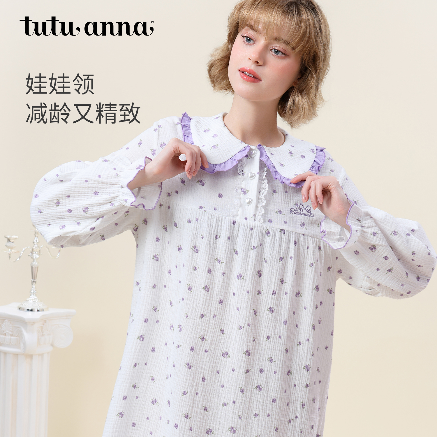 tutuanna秋季全棉睡衣女 双层纱小花满印娃娃领长袖睡裙家居服女