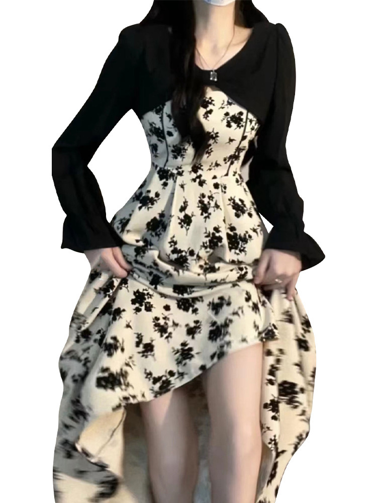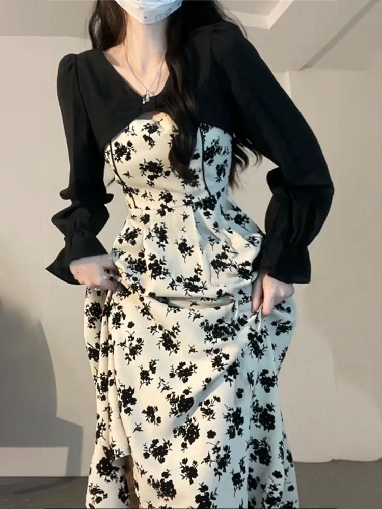 茶歇法式连衣裙子两件套装高级感桔梗长裙碎花裙女2025春季新款