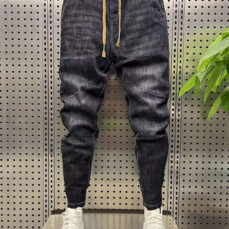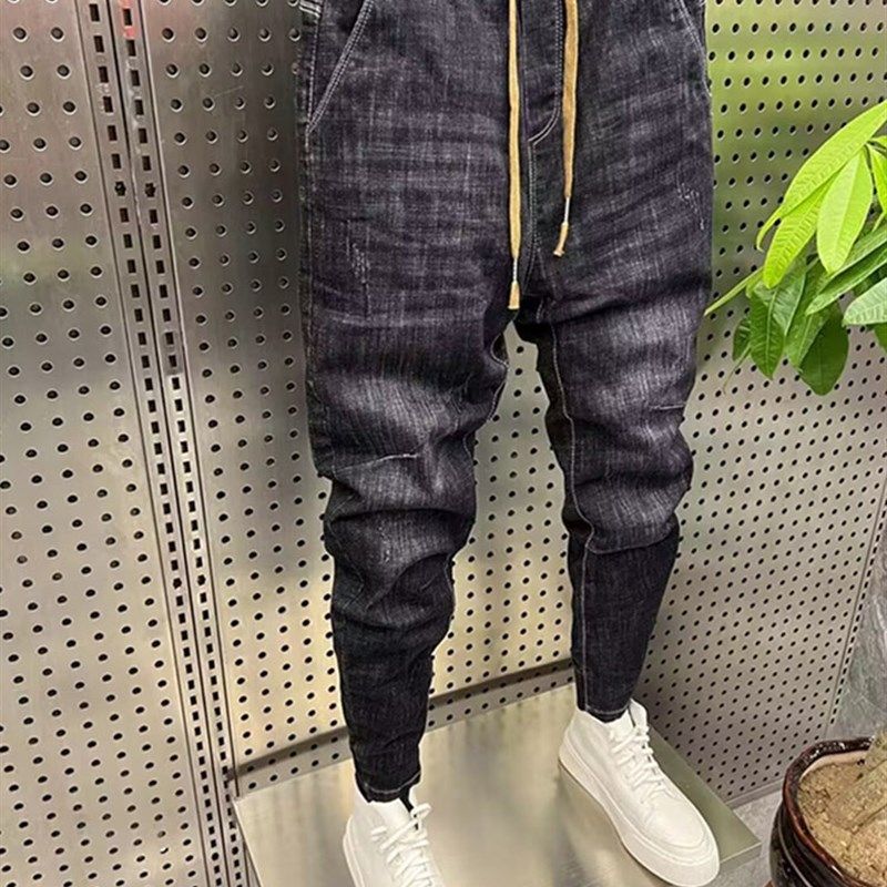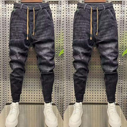 秋冬松紧腰牛仔裤修身小脚裤韩版潮流弹力黑色男士时尚百搭长裤子