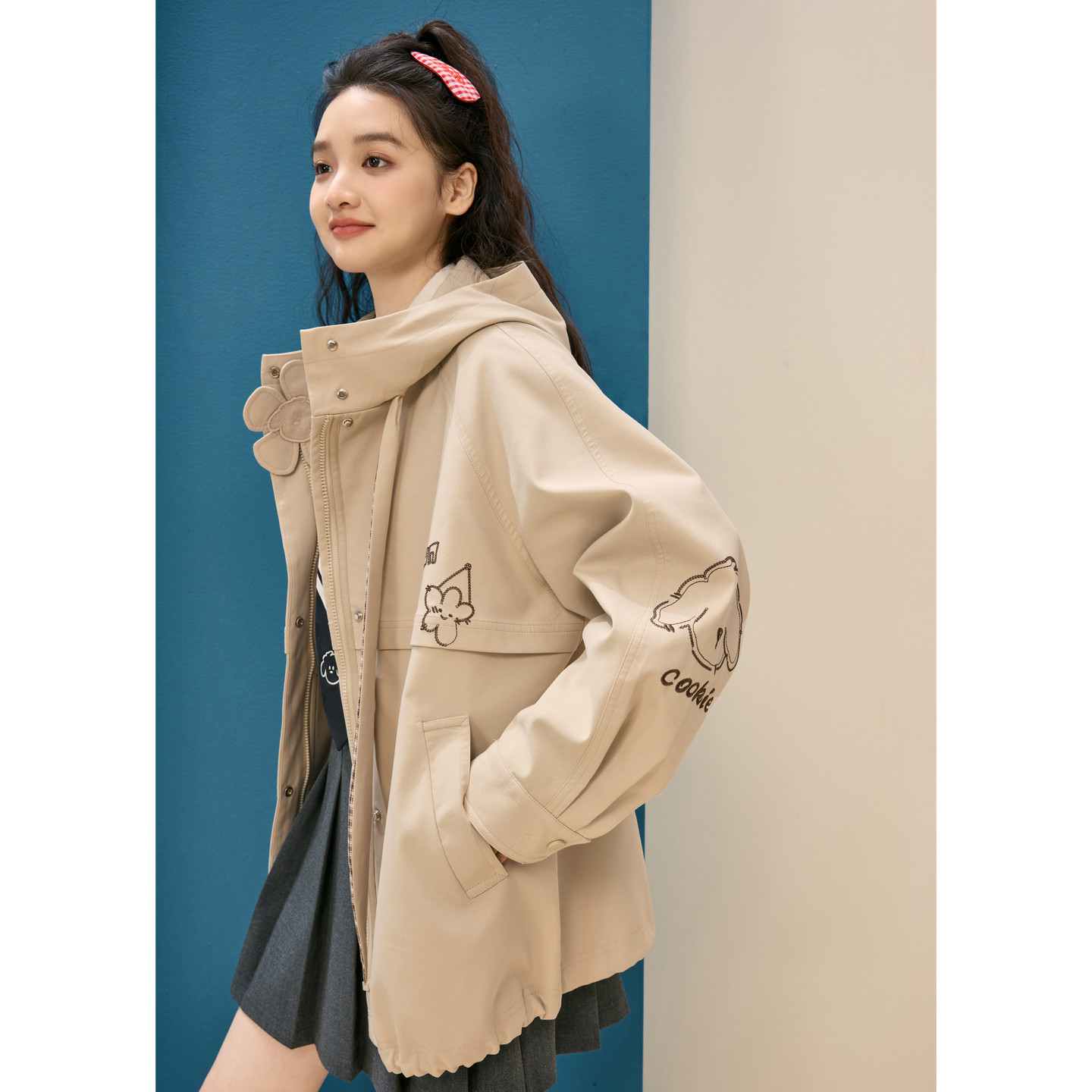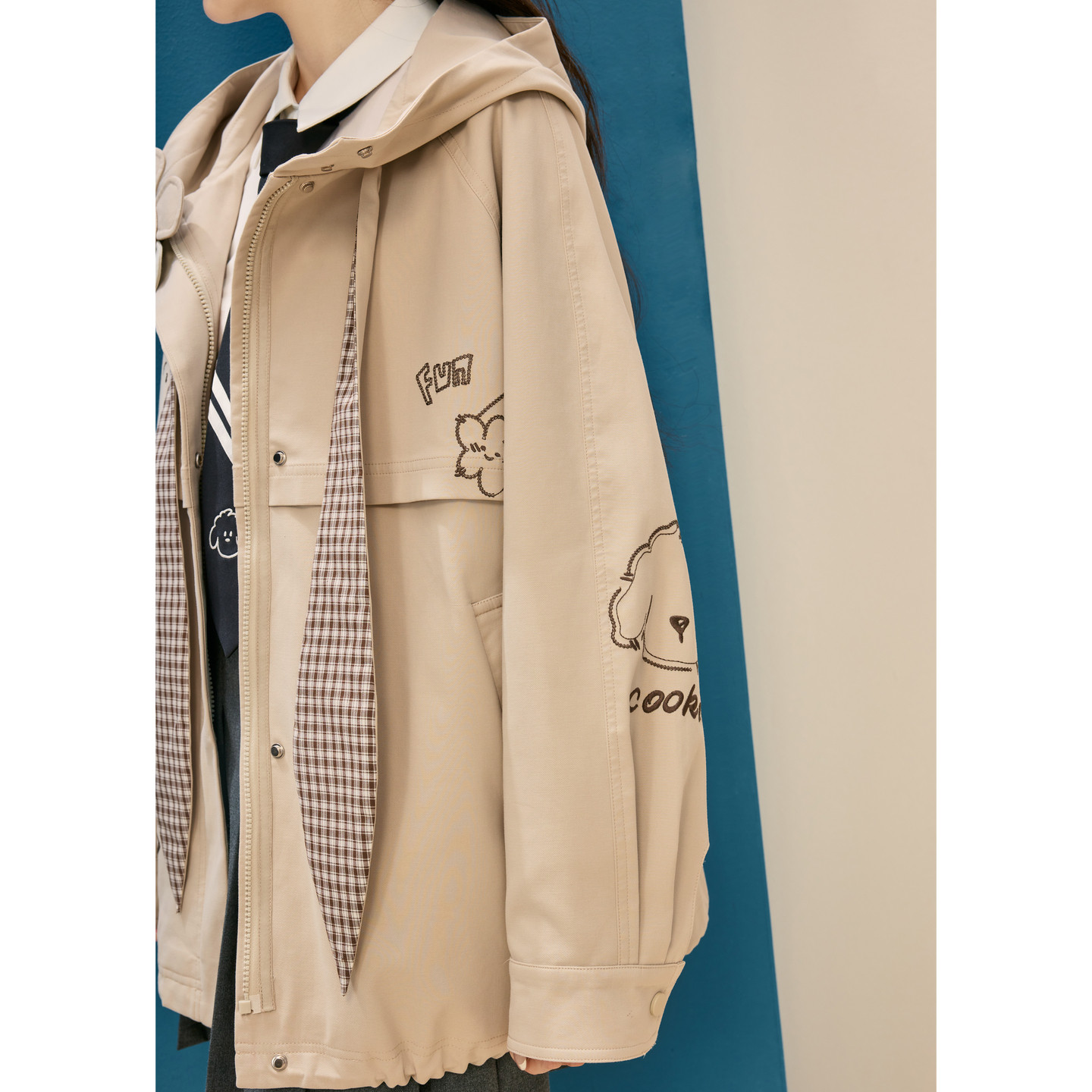 紫涵短款卡其色风衣女2026春季新款卡通刺绣格纹抽绳设计连帽外套