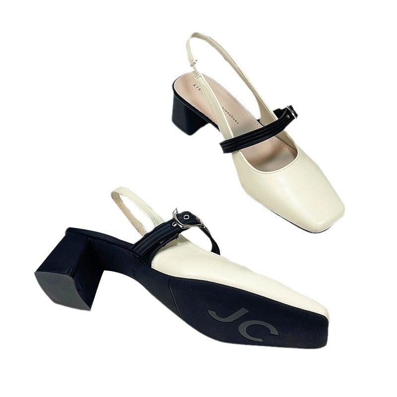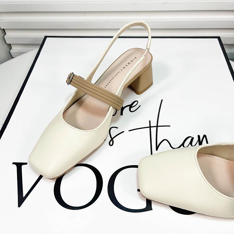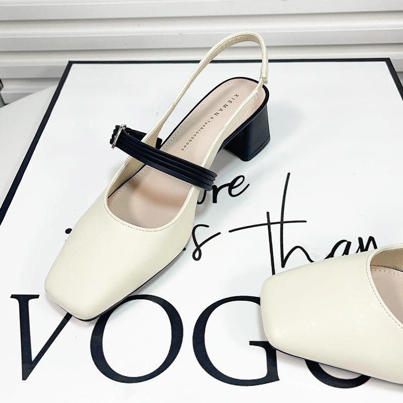 5805 法式一字带凉鞋女粗跟夏2025年新款方头米白色中跟浅口单鞋