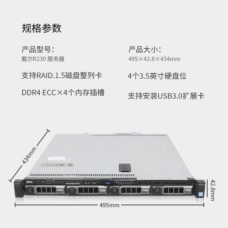 DELL戴尔R230服务器至强E3四核1U机架式静音ERP共享文件存储