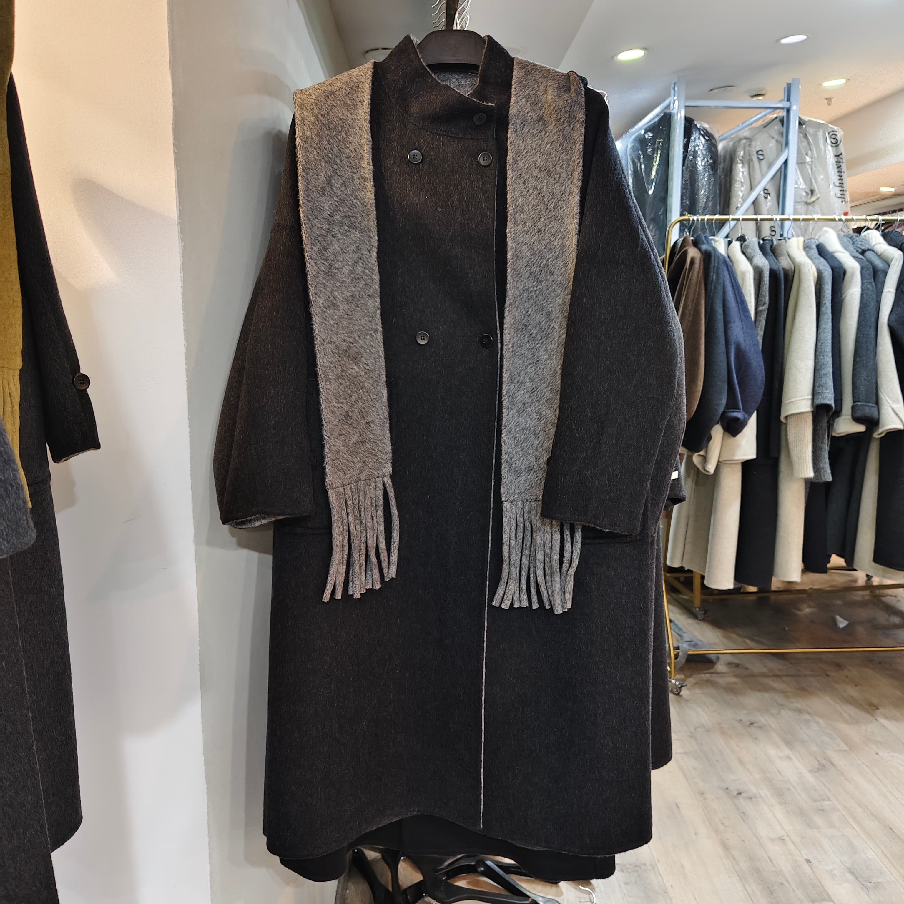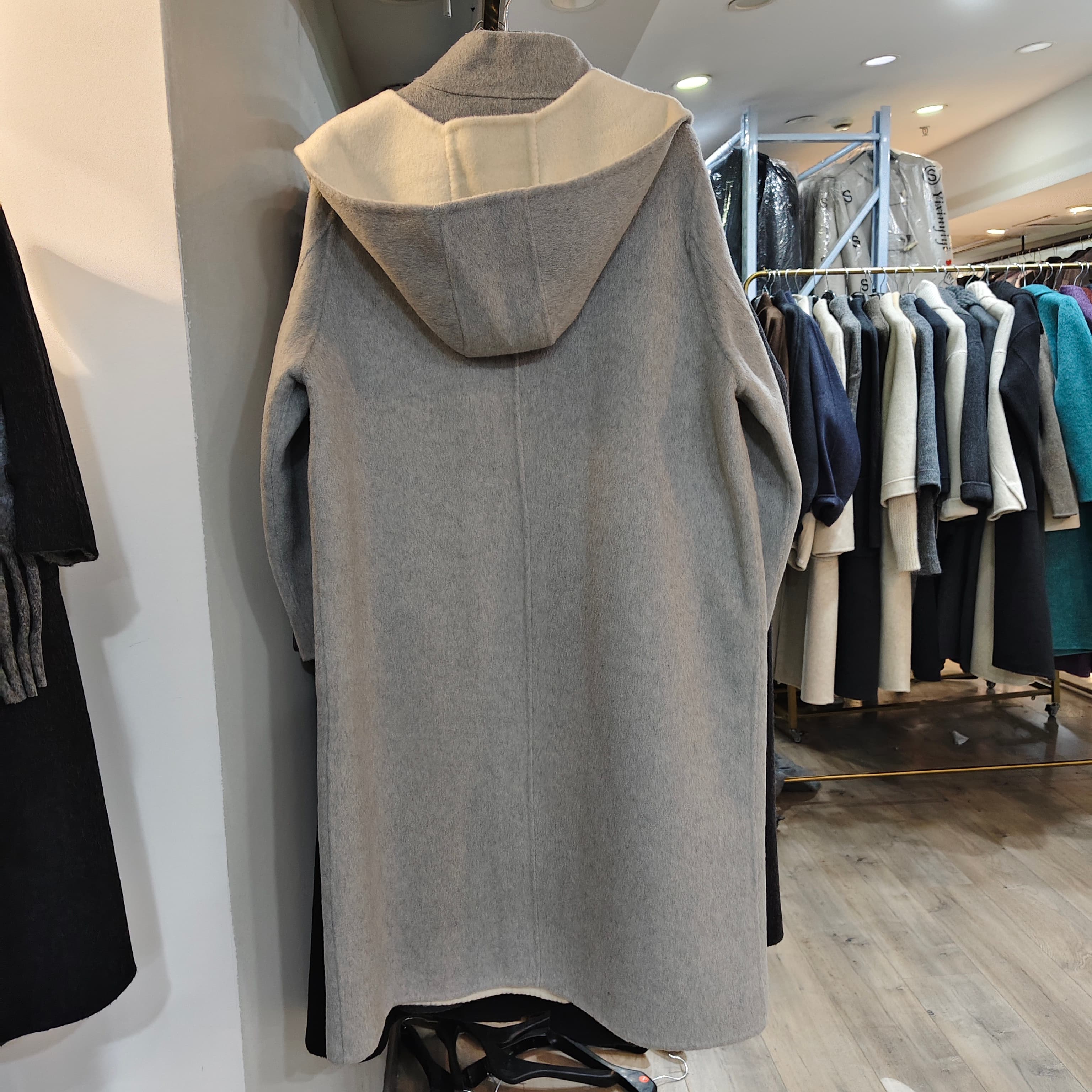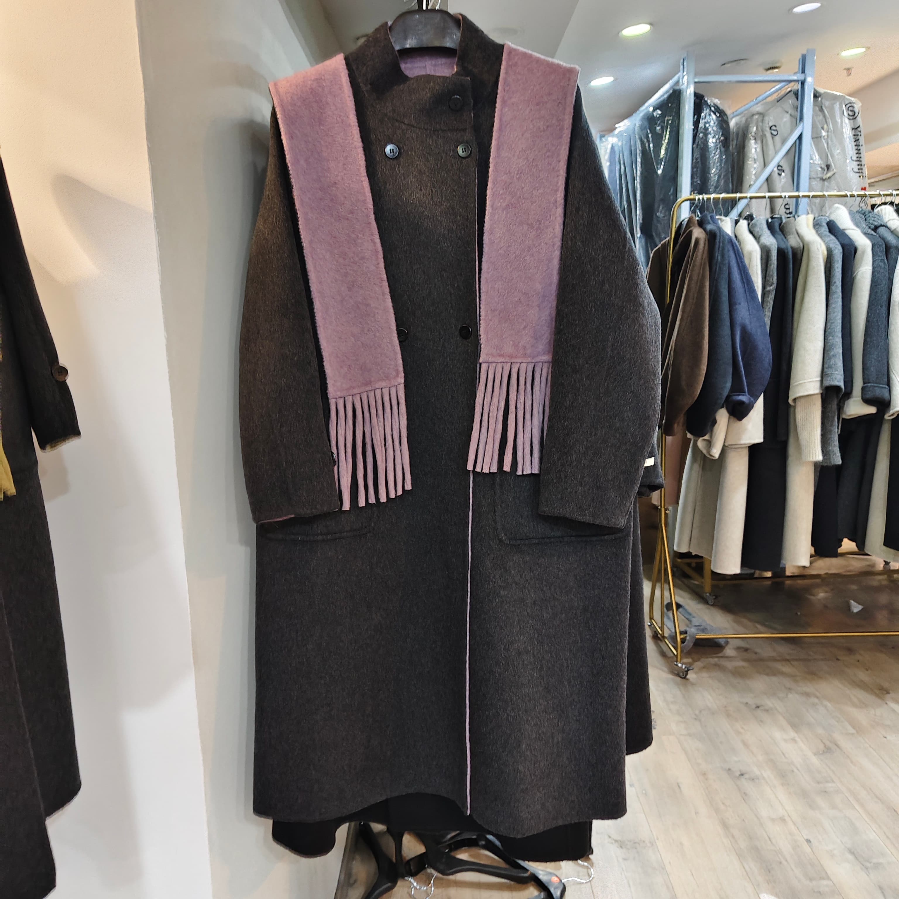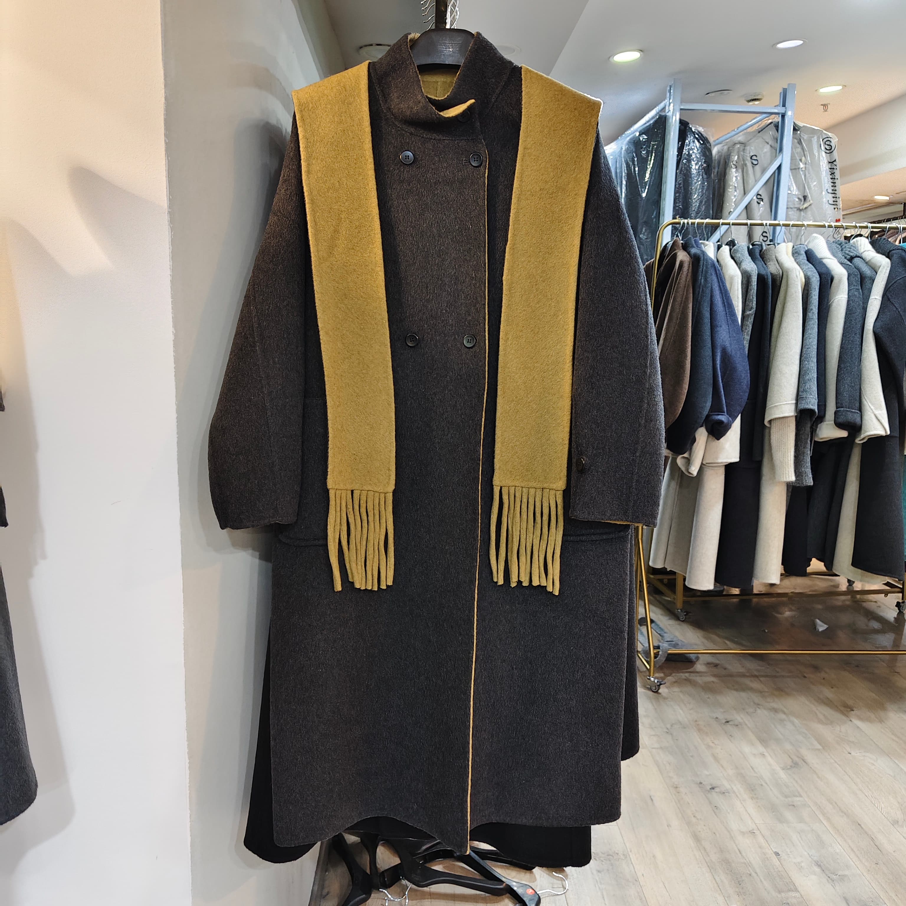 设计感拼色双排扣中长款双面羊毛大衣女高级感毛呢外套配帽领围巾